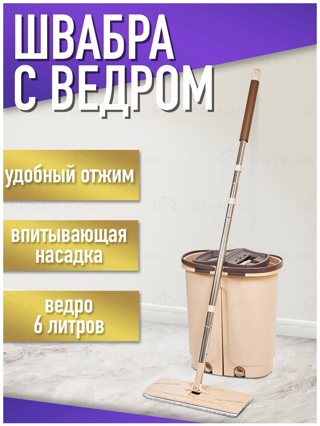 Купить Швабра 2 в 1 с отжимом с поворотом на 360 для мытья полов и окон / Бежевая швабра для уборки дома с телескопической ручкой и двухкамерным ведром 6 л