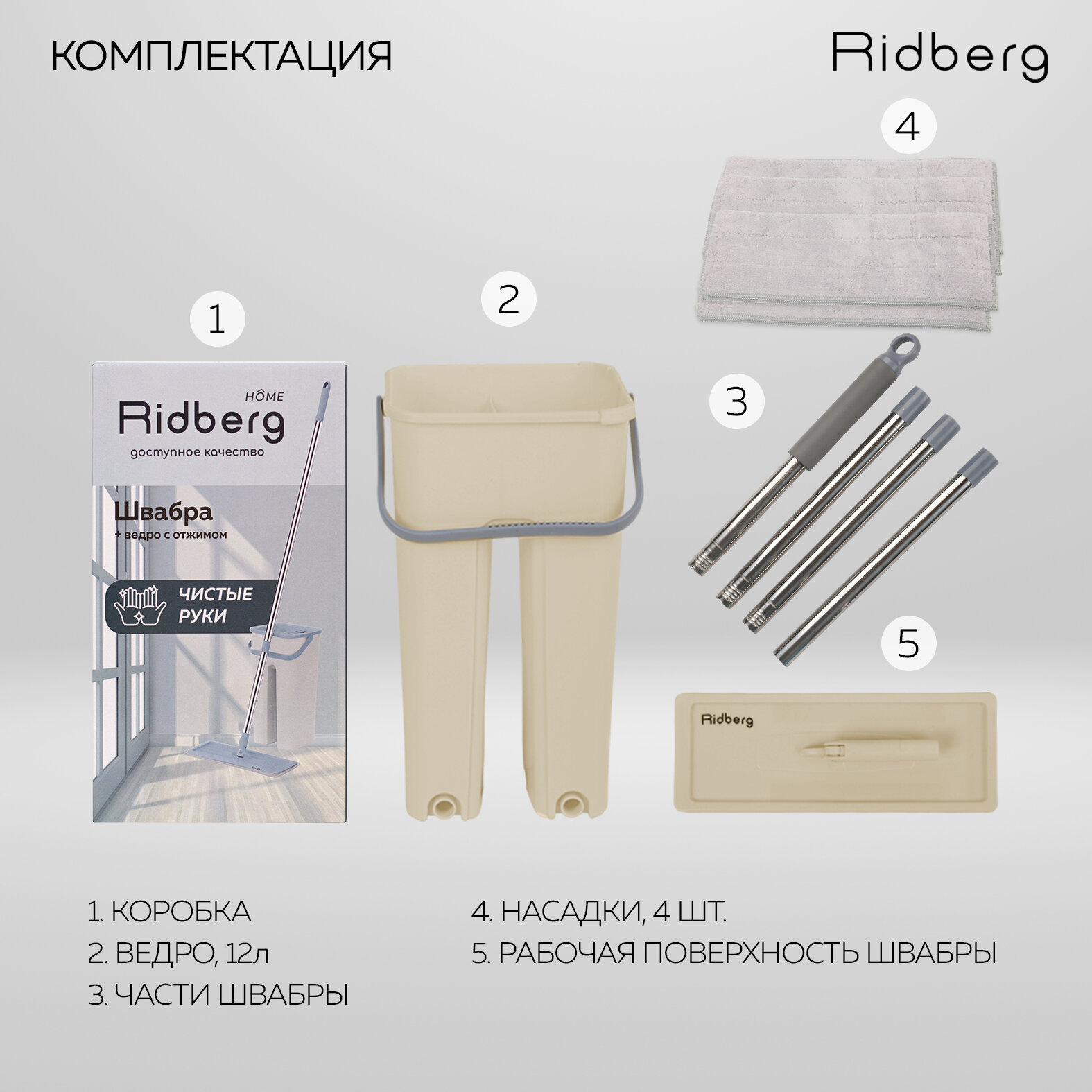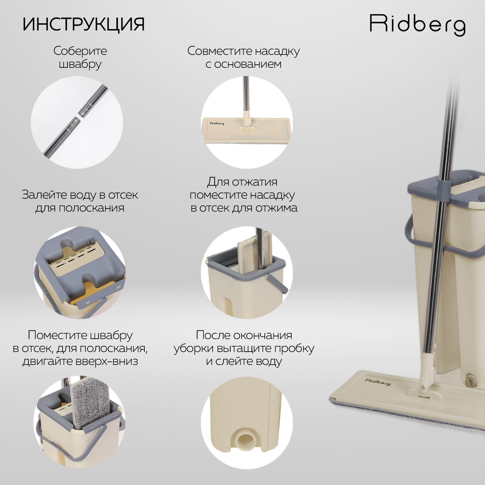 Купить Швабра с отжимом и ведром Ridberg Scrape Mop (Beige) / 5 л. / 4 микрофибры в комплекте