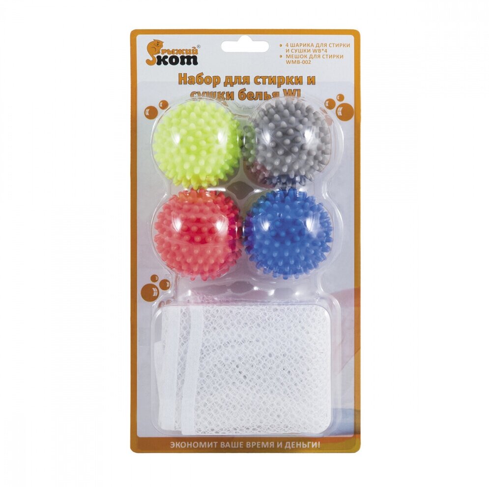 Набор для стирки и сушки белья Рыжий кот, 4 шарика диаметром 6 см+мешок 50 x 60 см