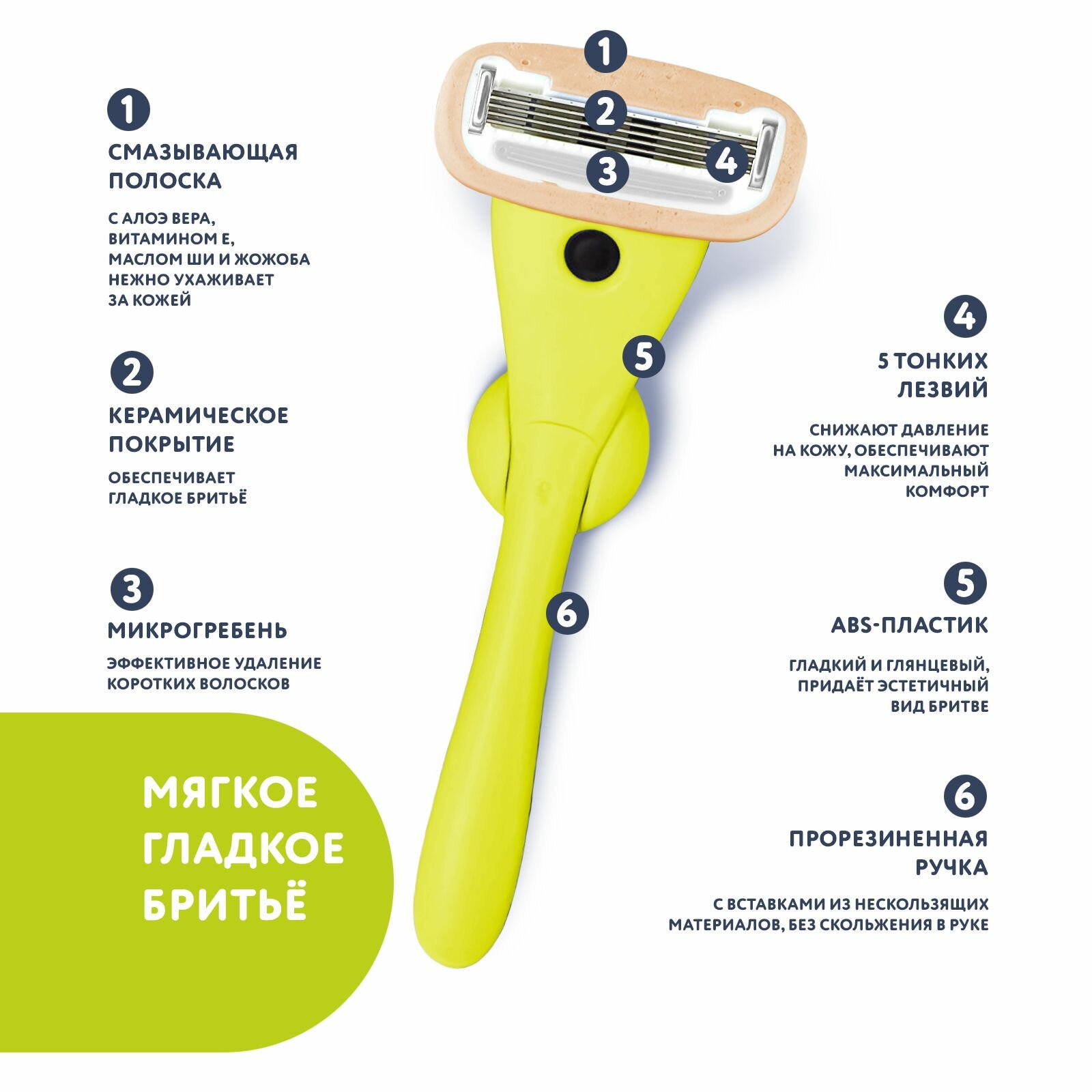 | Особенности | для чувствительной кожи / индикатор износа / керамическое покрытие лезвий / микрогребни / пенящиеся подушечки / плавающая головка / прорезиненная ручка / увлажняющая полоска |