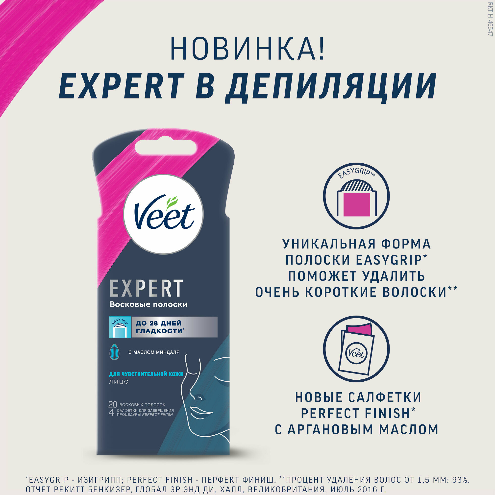 Восковые полоски для лица Veet Expert для чувствительной кожи, 20 шт