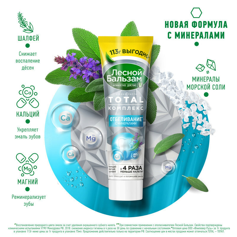 Зубная паста Лесной бальзам Отбеливание с минералами, 113 мл, 113 г, белый/голубой/зеленый/желтый/серебристый