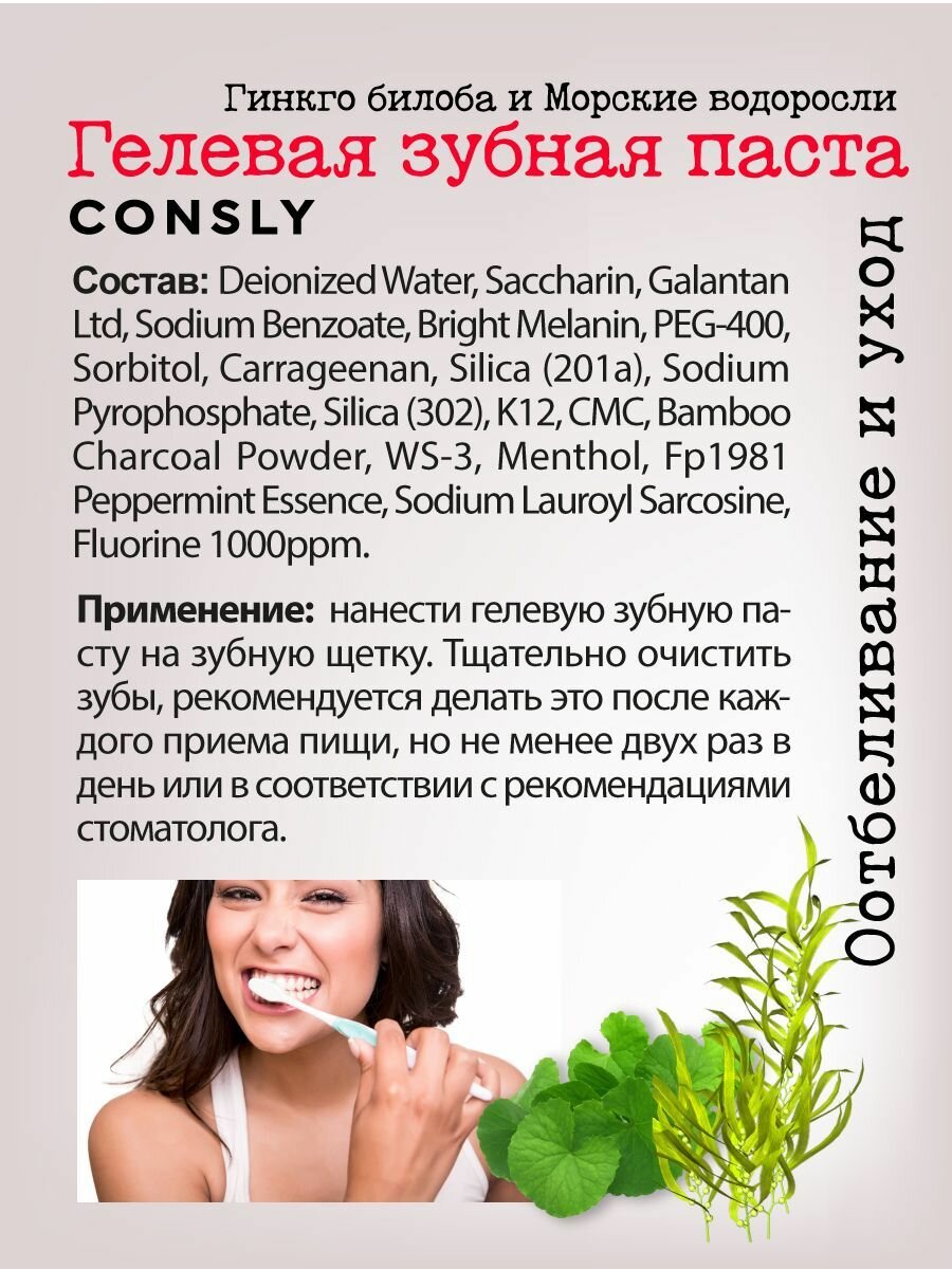 Consly Гелевая отбеливающая зубная паста для ухода за зубами Clean&Fresh с экстрактами гинкго билоба и морских водорослей, 105г