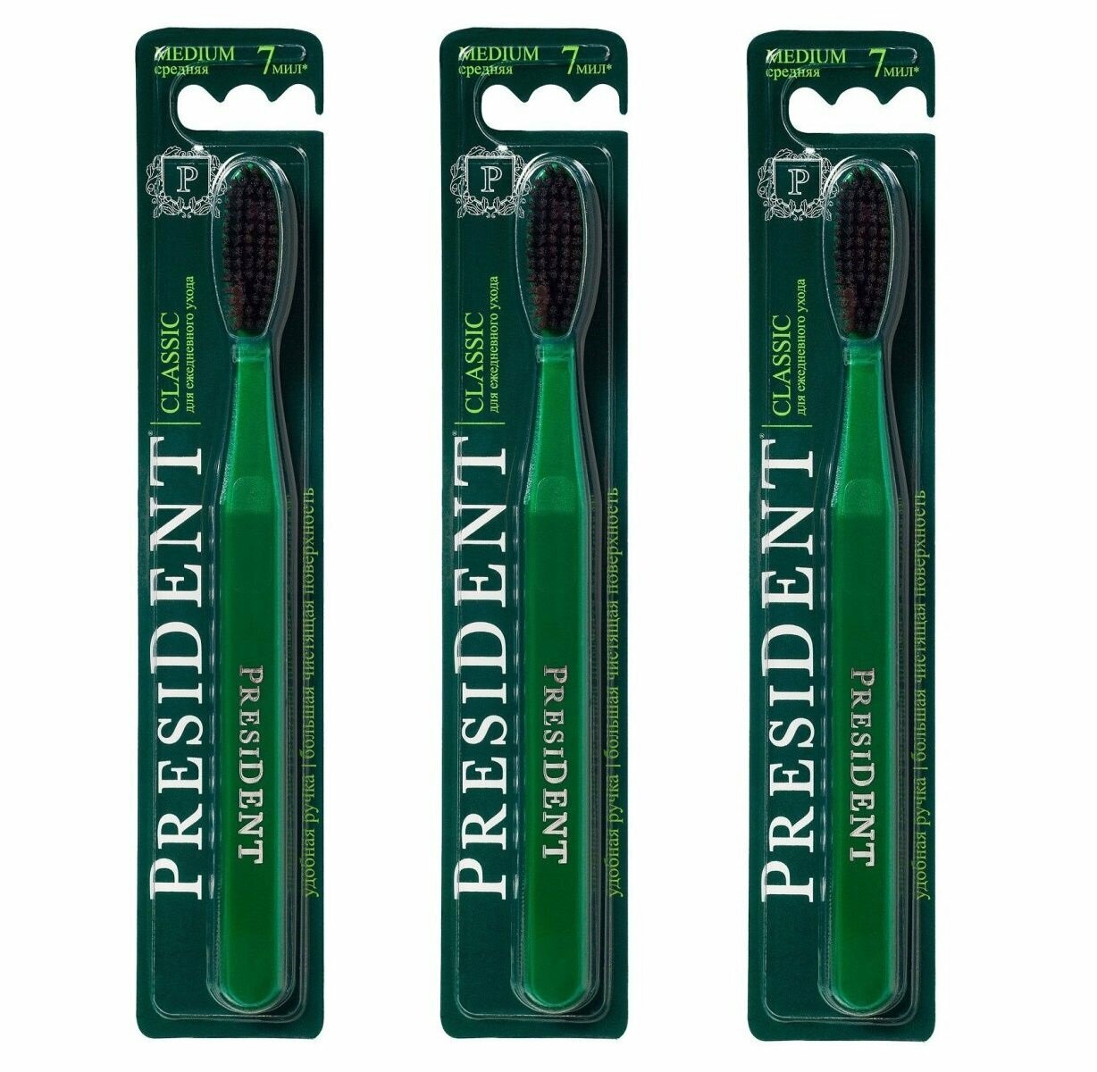 Купить Зубная щетка PresiDENT Classic Medium (7 МИЛ) Средней жесткости, зеленый / черный, диаметр щетинок 0.18 мм (3 щетки)
