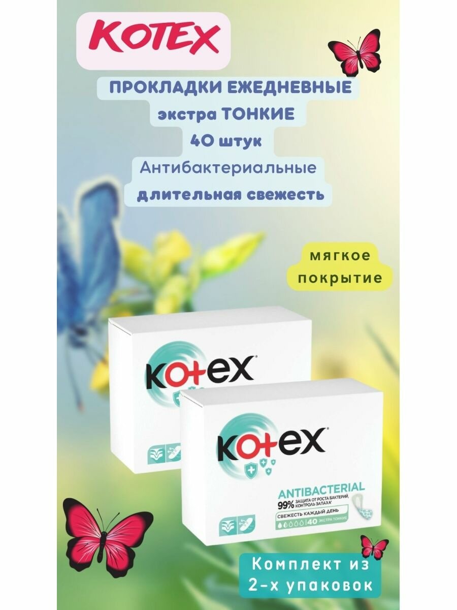 Ежедневные прокладки Kotex Antibacterial, с антибактериальным слоем, экстра тонкие, 40 шт