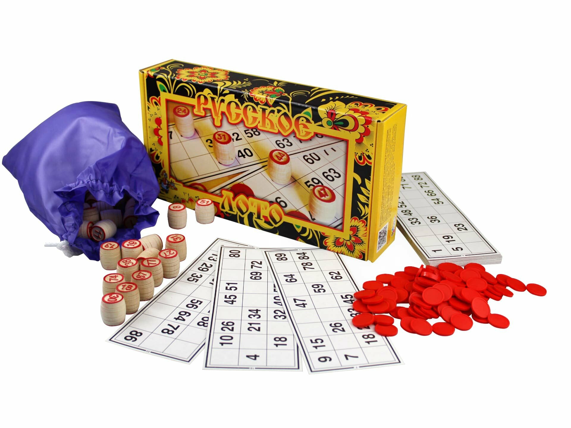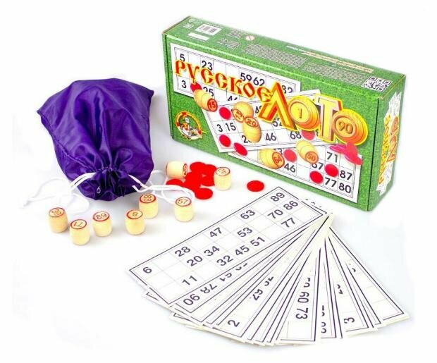 | Подробная комплектация | 90 бочонков, 100 пластиковых жетонов, 24 карточки, мешочек, правила игры |