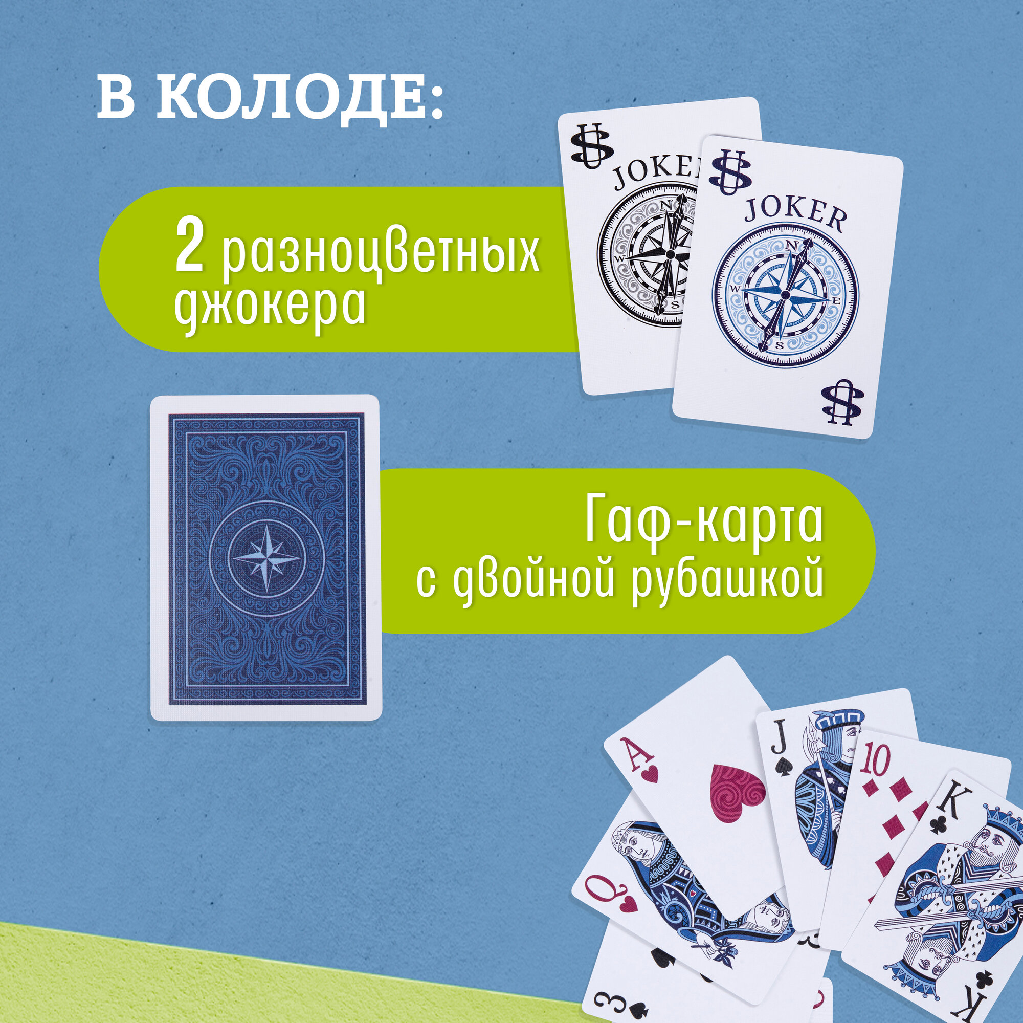 | Подробная комплектация | 52 игральные карты, 2 джокера, 2 рекламные карты |