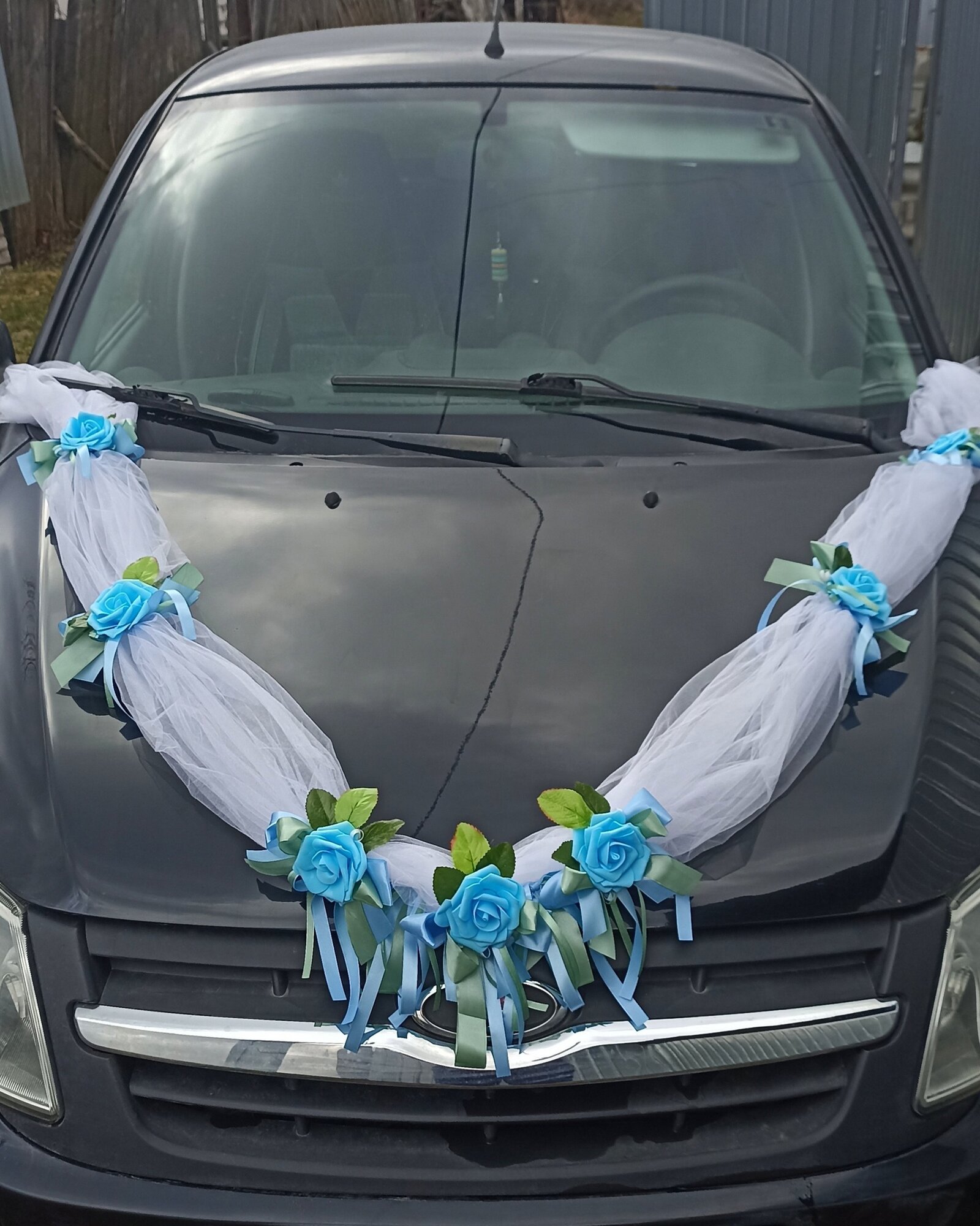 Свадебная лента на машину с цветами и бантами. Украшение на свадебный автомобиль.