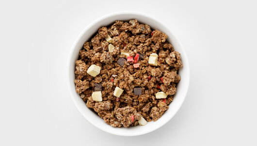 | Состав | запеченные хрустящие мюсли (цельнозерновые овсяные хлопья / тростниковый сахар / подсолнечное масло / кокос сушеный / пшеничная и рисовая мука / цельнозерновые пшеничные хлопья / какао-порошок / ячменный солод / мед / соль) / бельгийский темный шоколад (какао-тёртое / тросниковый сахар / какао-масло / эмульгатор натуральный соевый лецитин / ваниль натуральная) / кусочки банана и клубники сублимационной сушки |