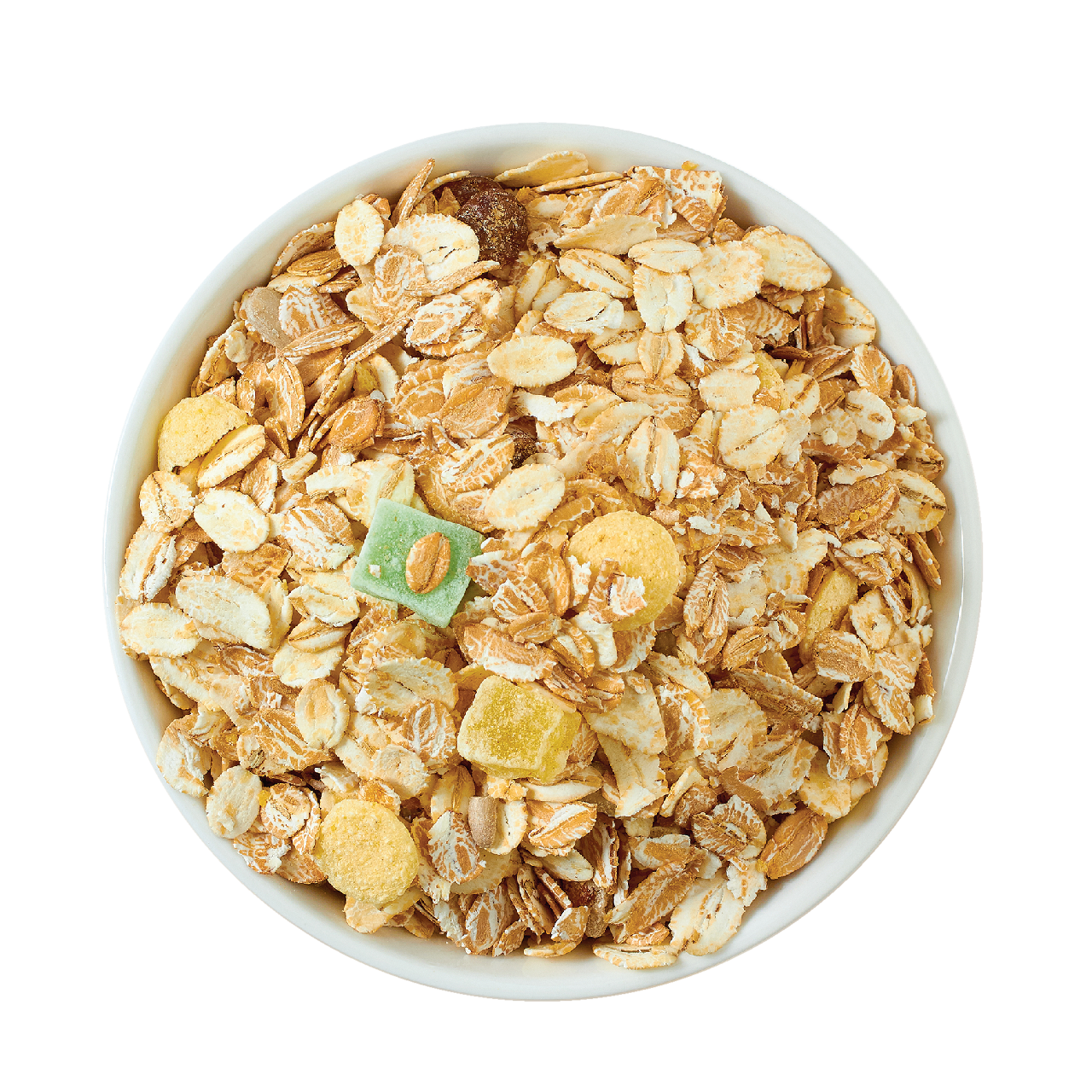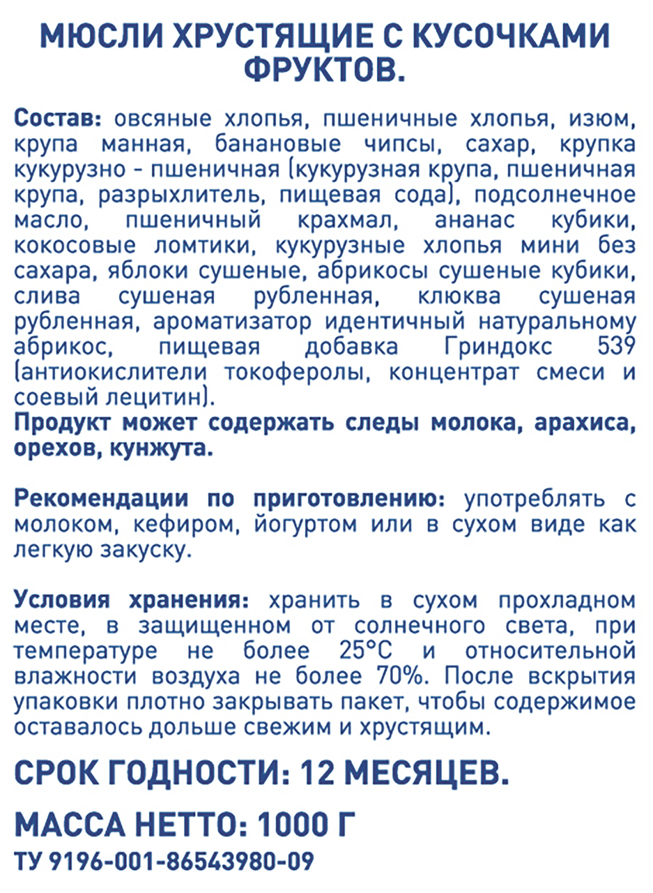 | Состав | Овсяные хлопья / пшеничные хлопья / сахар / изюм / крупа манная / банановые чипсы / крупка кукурузно-пшеничная (кукурузная крупа / пшеничная крупа / разрыхлитель: пищевая сода) / растительное подсолнечное масло / пшеничный крахмал / ананас кубики / кокосовые ломтики / кукурузные хлопья мини без сахара / яблоки сушеные / абрикосы сушеные кубики / слива сушеная рубленная / клюква сушеная рубленная / ароматизатор идентичный натуральному абрикос / пищевая добавка гриндокс 539 (антиокислители токоферолы / концентрат смеси и соевый лецитин) / йодированная соль |