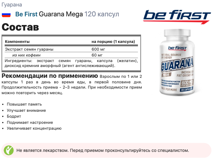 Про гуарану узнала от подруги, она у меня увлекается подбором дополнительных добавок. Ее рекомендаций прислушалась и взяла от be first. Мне нравится результат приема гуараны, меньше клюю носом на работе)
