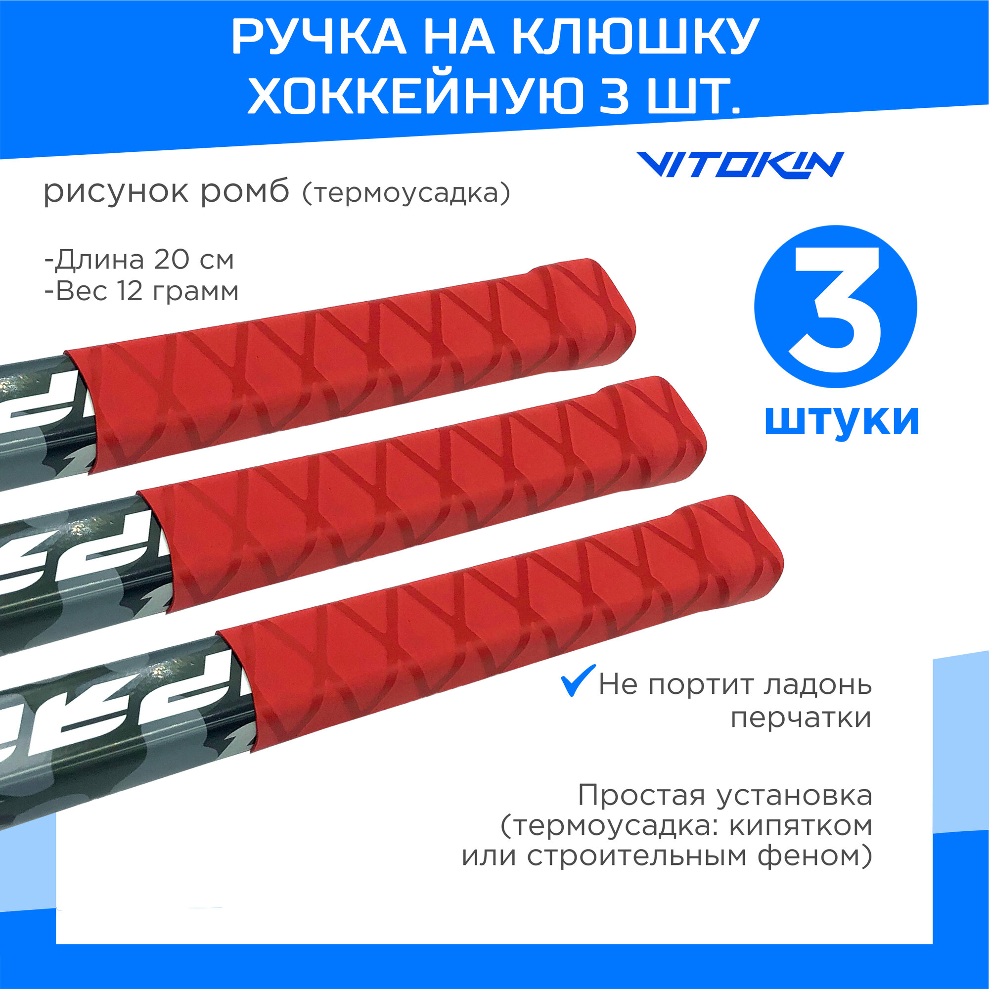 Купить Ручка на хоккейную клюшку с термоусадкой VITOKIN, цвет красный, 3 шт