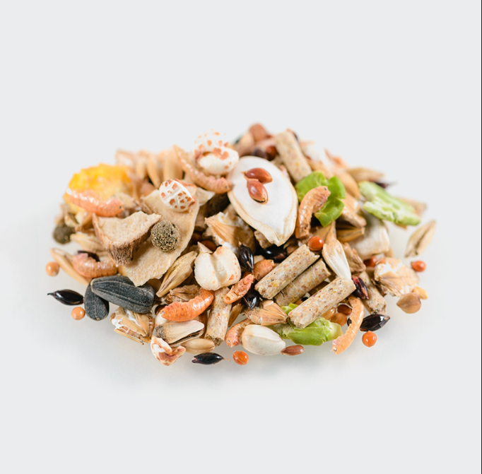 | Состав | Гранулы (семена злаковых и бобовых культур, гаммарус, пробиотик и пребиотик), просо, ячмень, суданка, овсяная крупа, ячменные хлопья, канареечник, греча, семена сафлора, льна, рапса, гороховые хлопья, топинамбур*, семена подсолнечника, кукурузные хлопья, травяные гранулы, гаммарус, тыквенные семечки, корень пастернака*, створки фасоли*, взорванная греча. * - компоненты, способствующие правильному обмену глюкозы. |