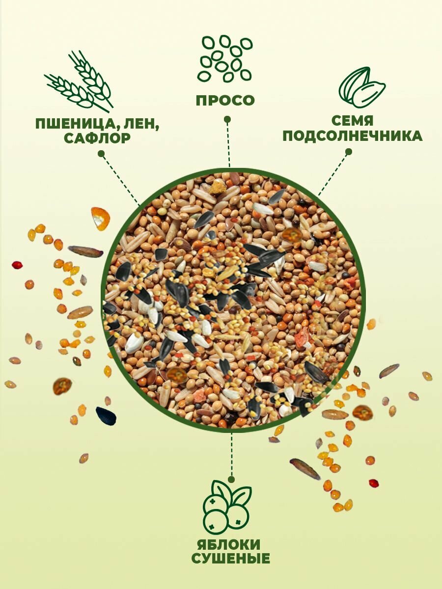 | Состав | просо, овес, подсолнечник, пшеница, лен, сушеные фрукты |