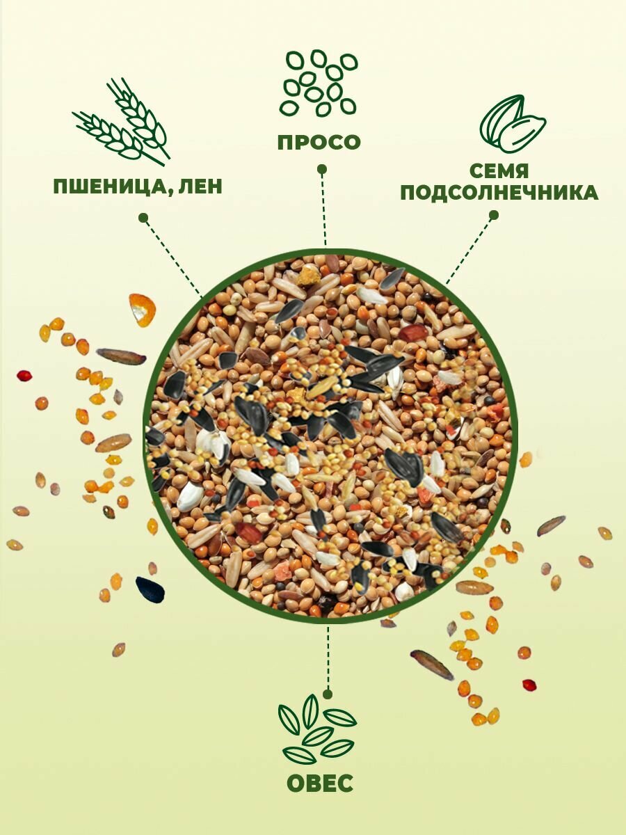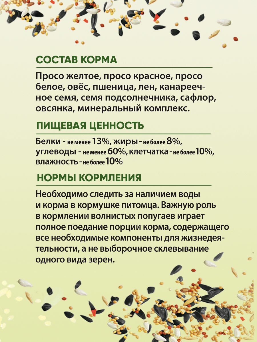 | Состав | просо желтое, просо красное, просо белое, овес, овсянка, подсолнечник, пшеница, лен, канареечное семя, сафлор, трикальций-фосфат, мел |