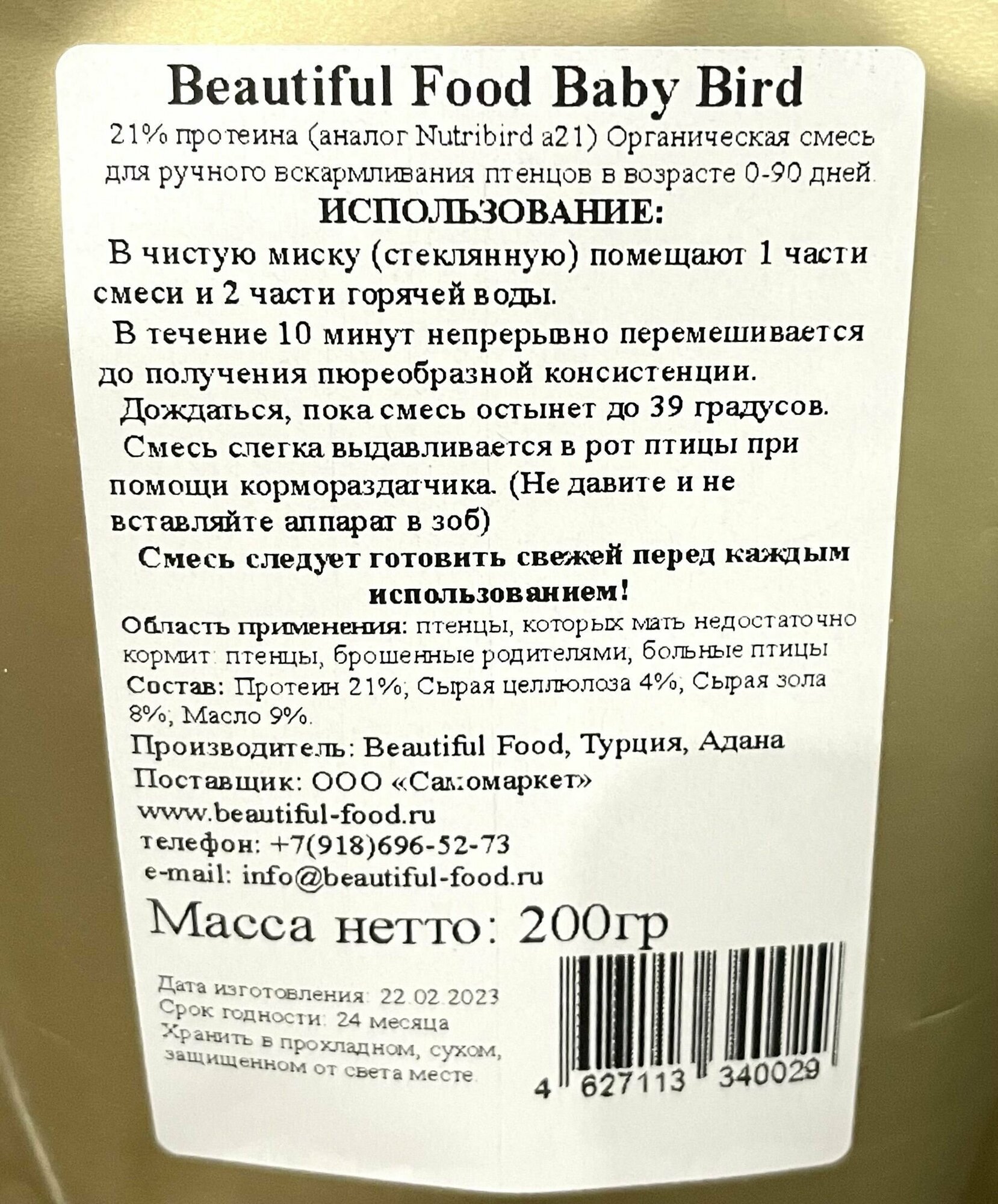 Купить Смесь для выкармливания птенцов Beautiful Food Baby Bird 0,2 кг (21% протеина), альтернатива Nutribird а21