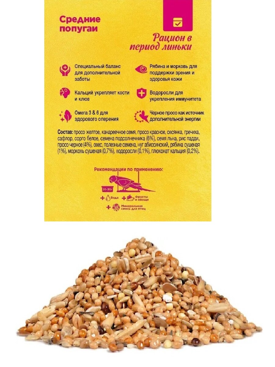 | Отзыв: | корм для средних попугаев в период линьки - беру его обычно еще и для подкормки зимой |