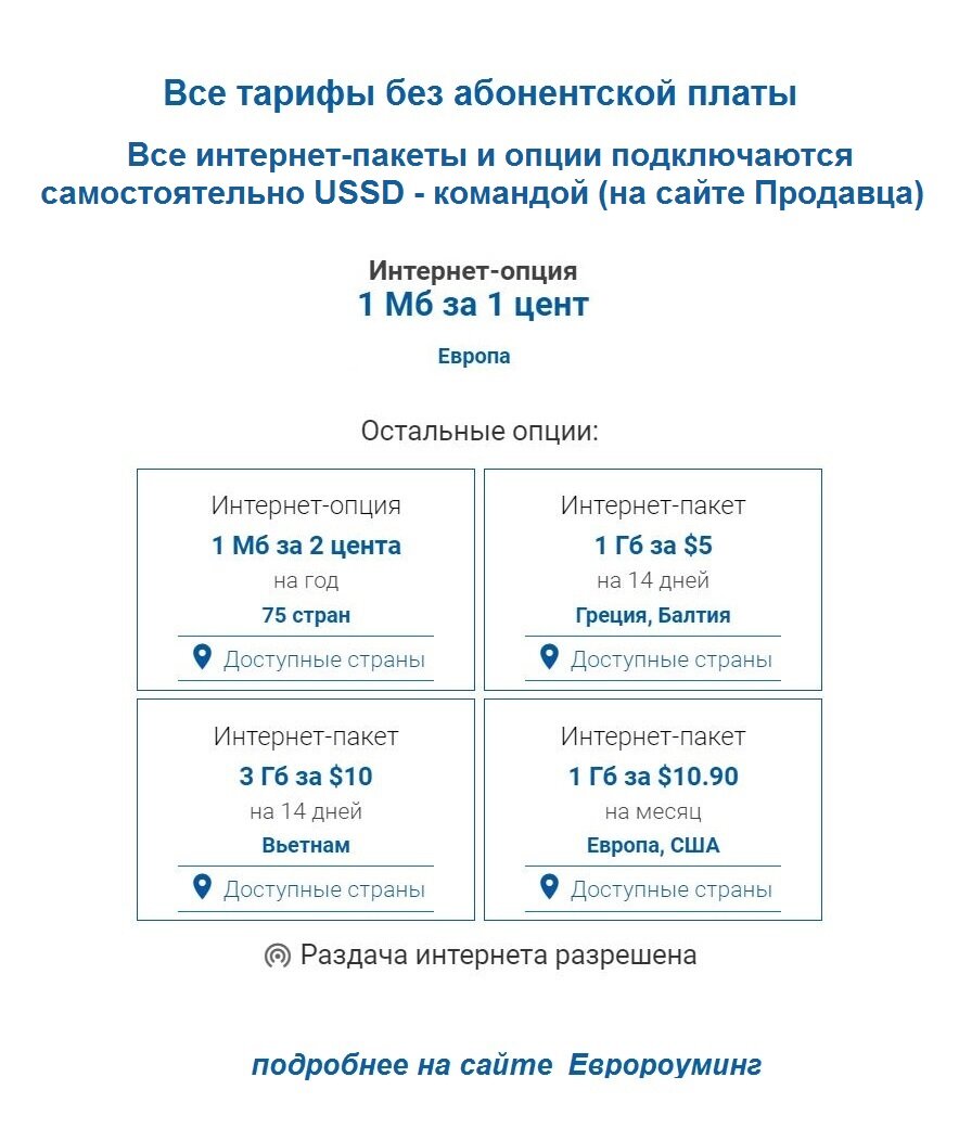 | Дополнительная информация | без абонентской платы, входящие SMS бесплатны, входящие звонки бесплатны, не подходит для регистрации в зарубежных аккаунтах с территории РФ |