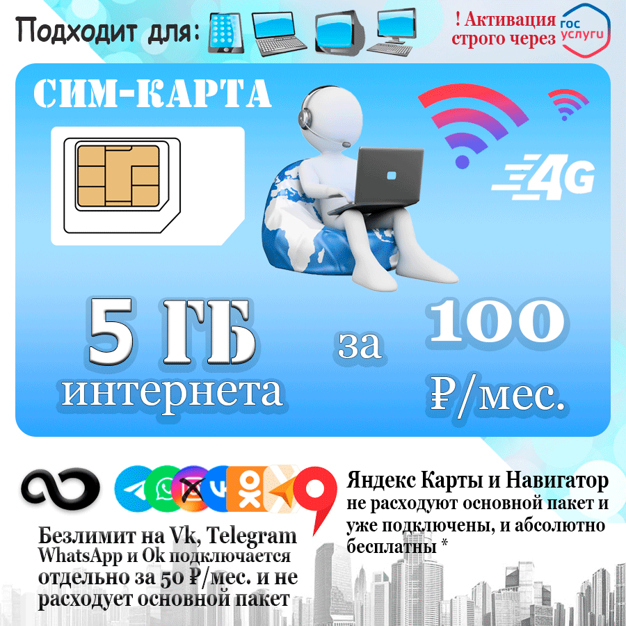SIM-карта Безлимит по РФ с Wi Fi, для всех устройств, 990 р / в месяц/ сим карта