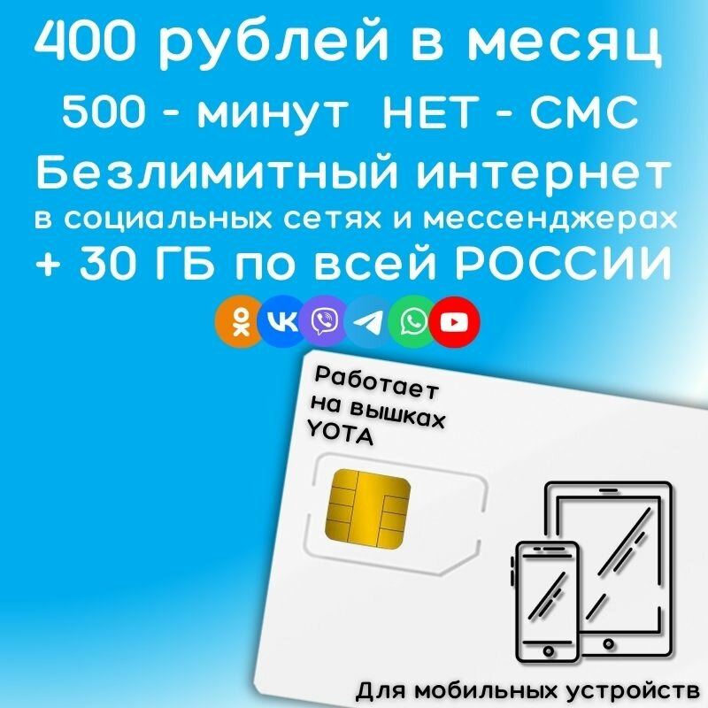 Купить Сим карта YOTA Безлимитный интернет в социальных сетях и мессенджерах 400 рублей в месяц + 30 ГБ по РФ 4G LTE YAYOV1