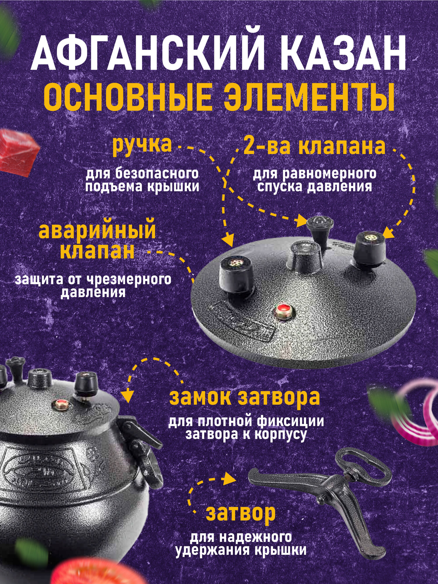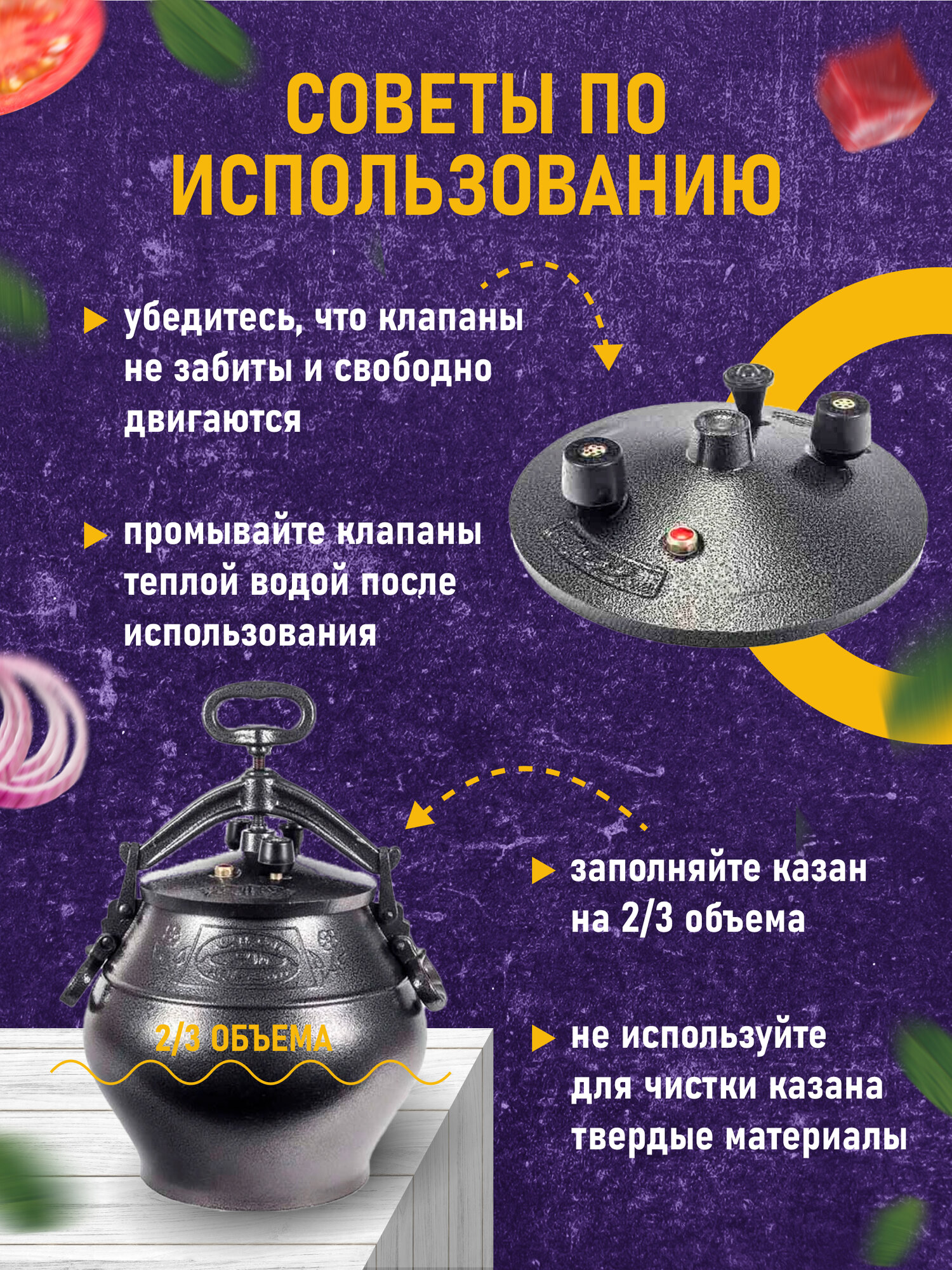 | Дополнительная информация | комплектация: казан - 1 шт, боковые ручки - 2 шт, верхняя ручка - 1 шт, крышка - 1 шт, предохранительный клапан - 1 шт, клапан для отвода пара - 2 шт, инструкция на русском языке - 1 шт |