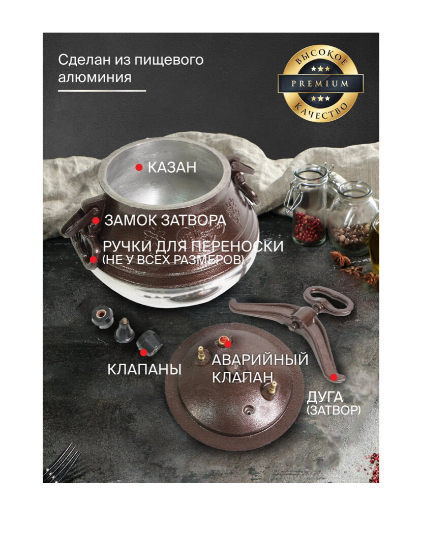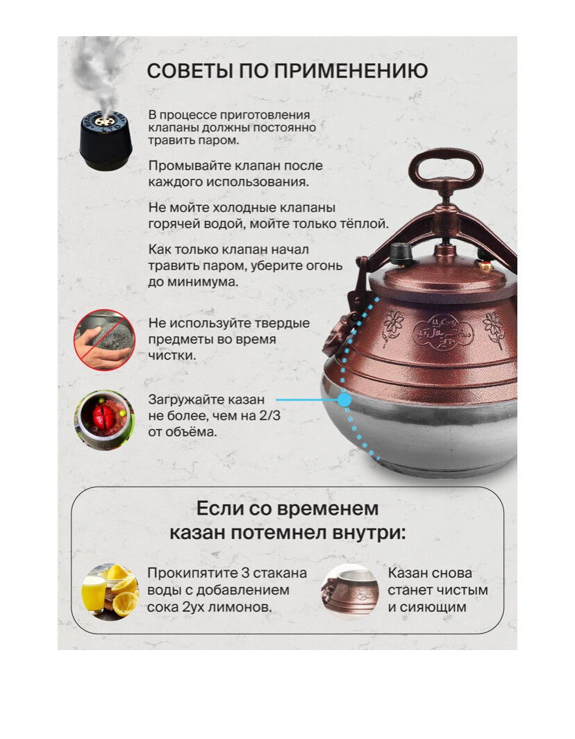| Дополнительная информация | полезный объем меньше указанного производителем; на глянцевой поверхности допустимы следы шлифовки; комплектация: казан - 1 шт, боковые ручки - 2 шт, верхняя ручка - 1 шт, крышка - 1 шт, предохранительный клапан - 1 шт, клапан для отвода пара - 2 шт, инструкция на русском языке - 1 шт, коробка |