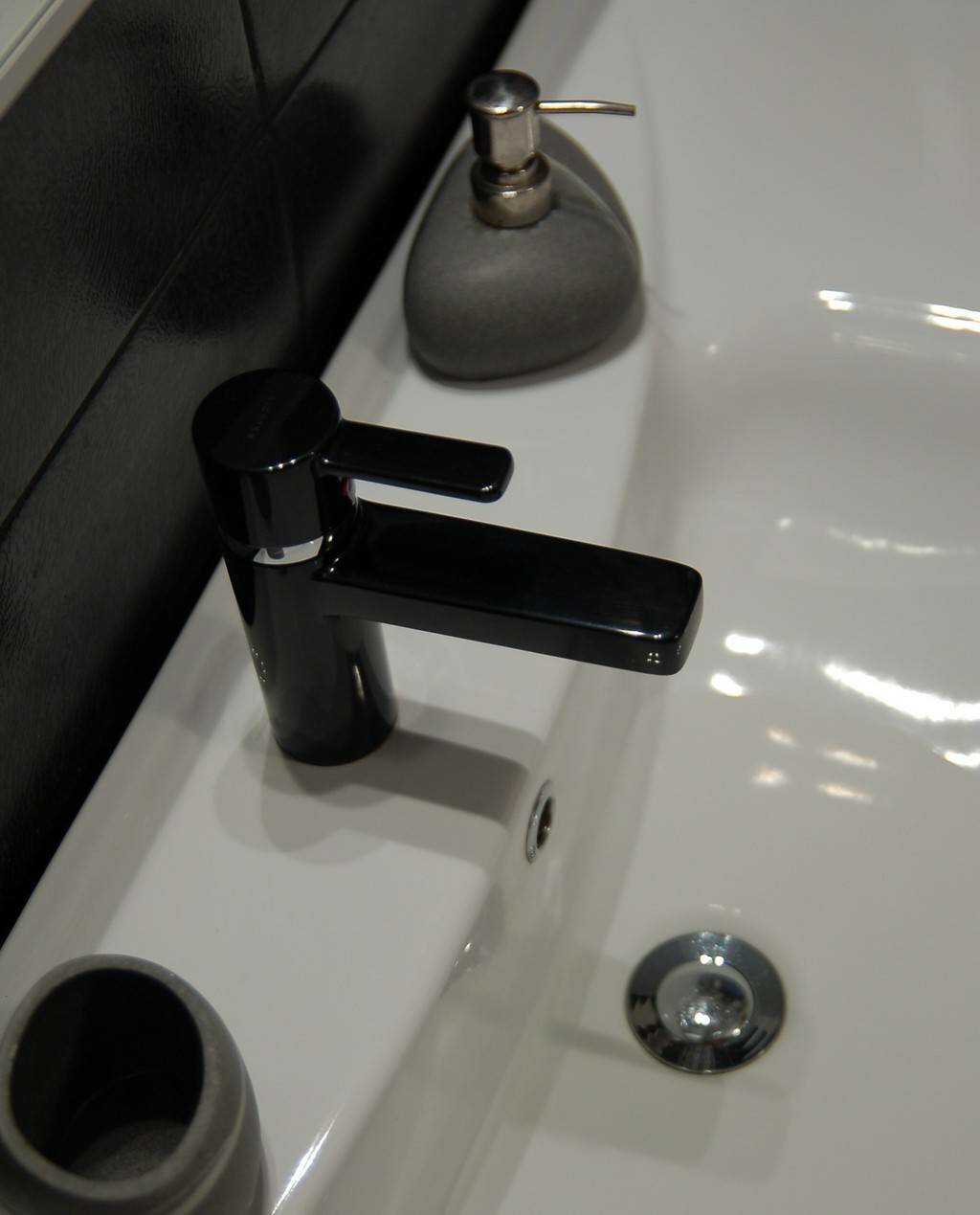 Смеситель для умывальника Kludi Zenta, арт. 382608675, неповоротный излив, хром / чёрный, с донным клапаном, 14,8 см