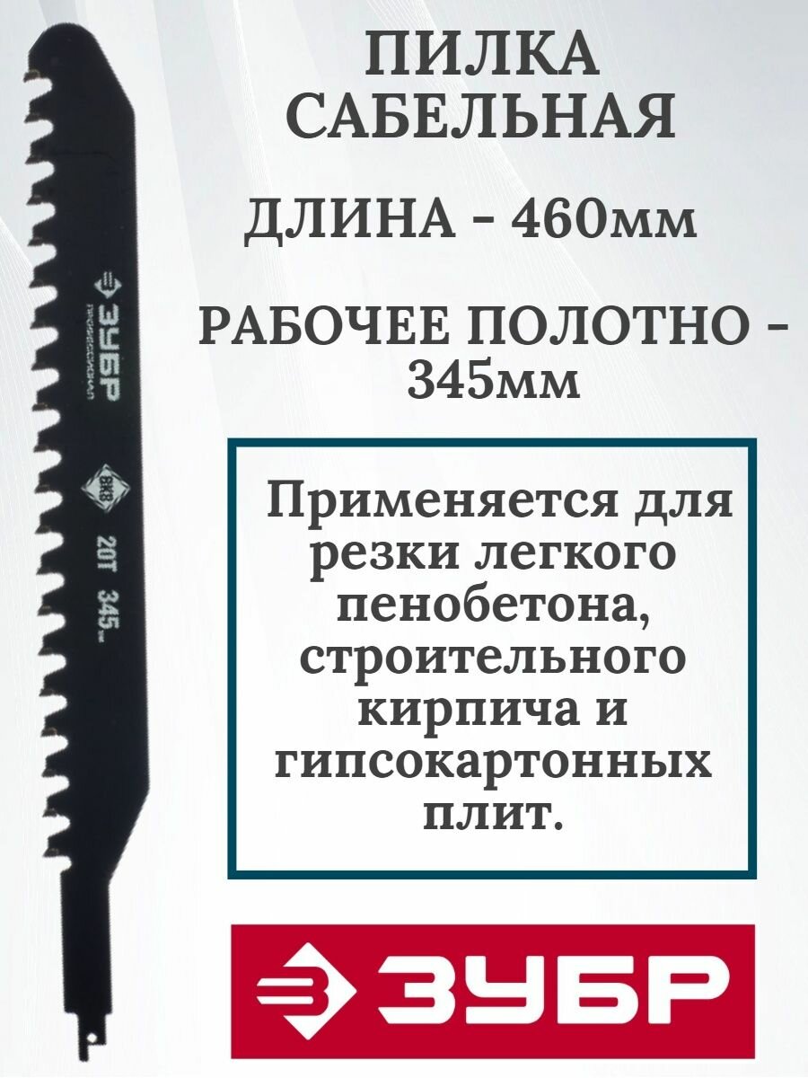 ЗУБР 460/350, 20T, с тв. зубьями для сабельной эл. ножовки, полотно по лёгкому бетону Профессионал (159772-20)
