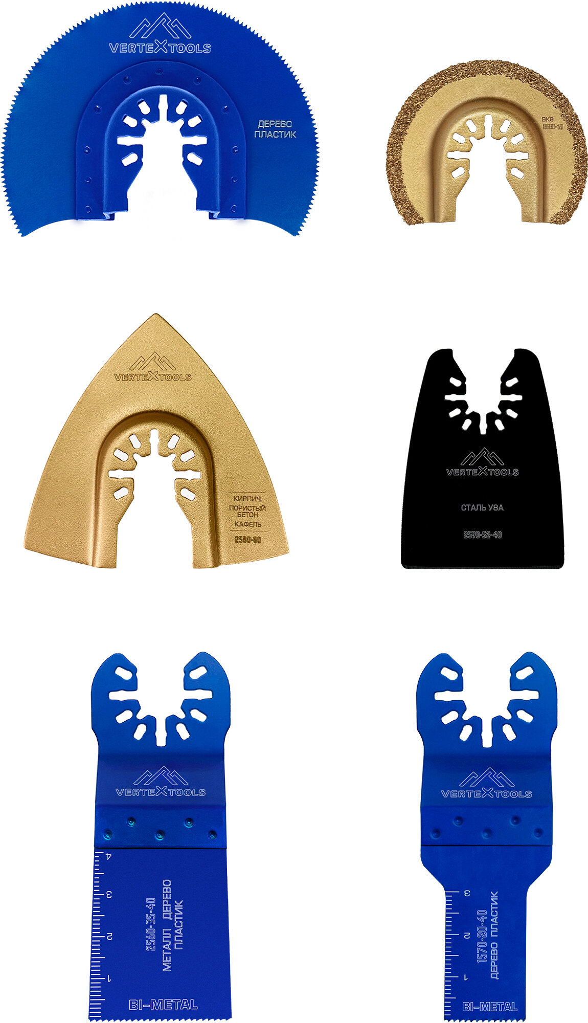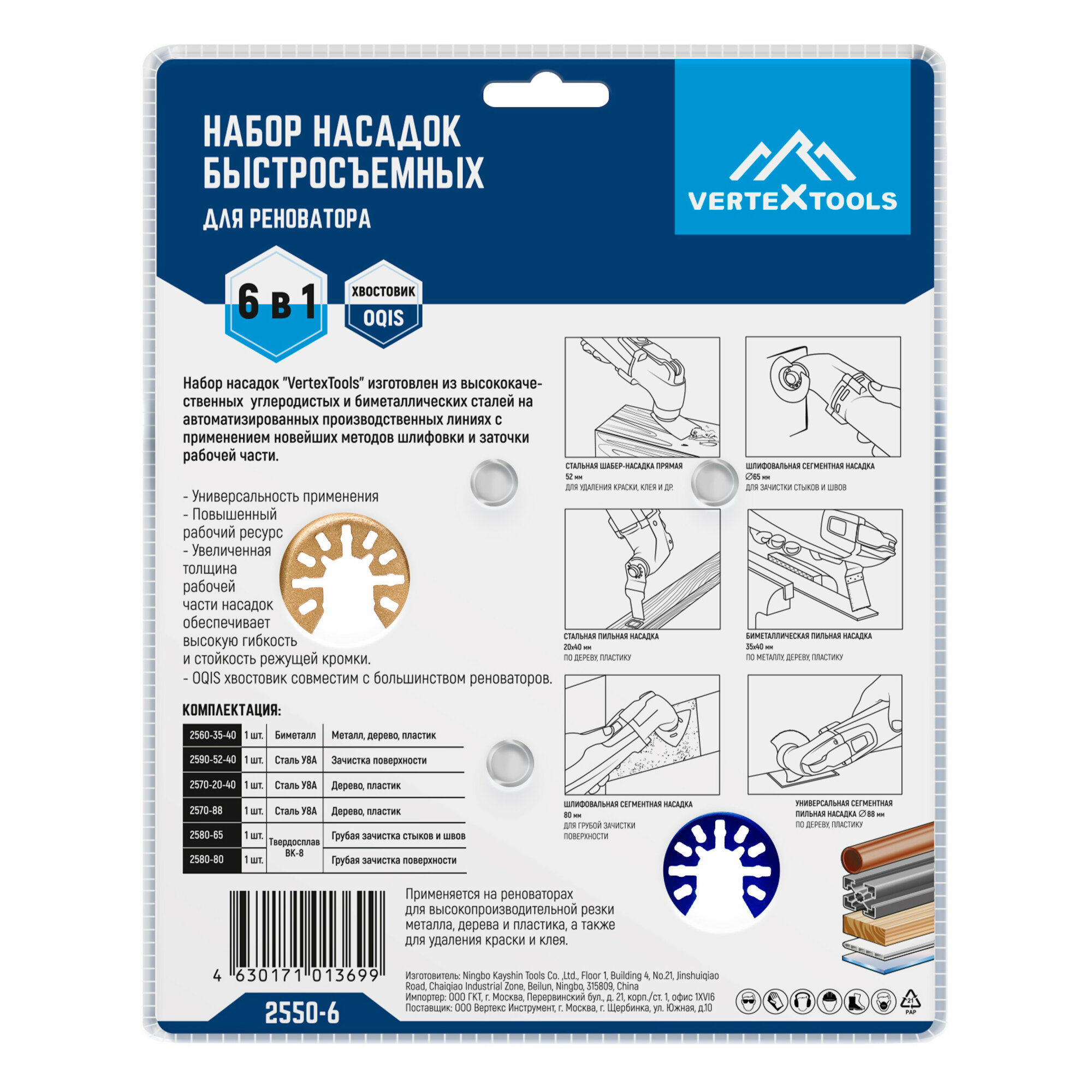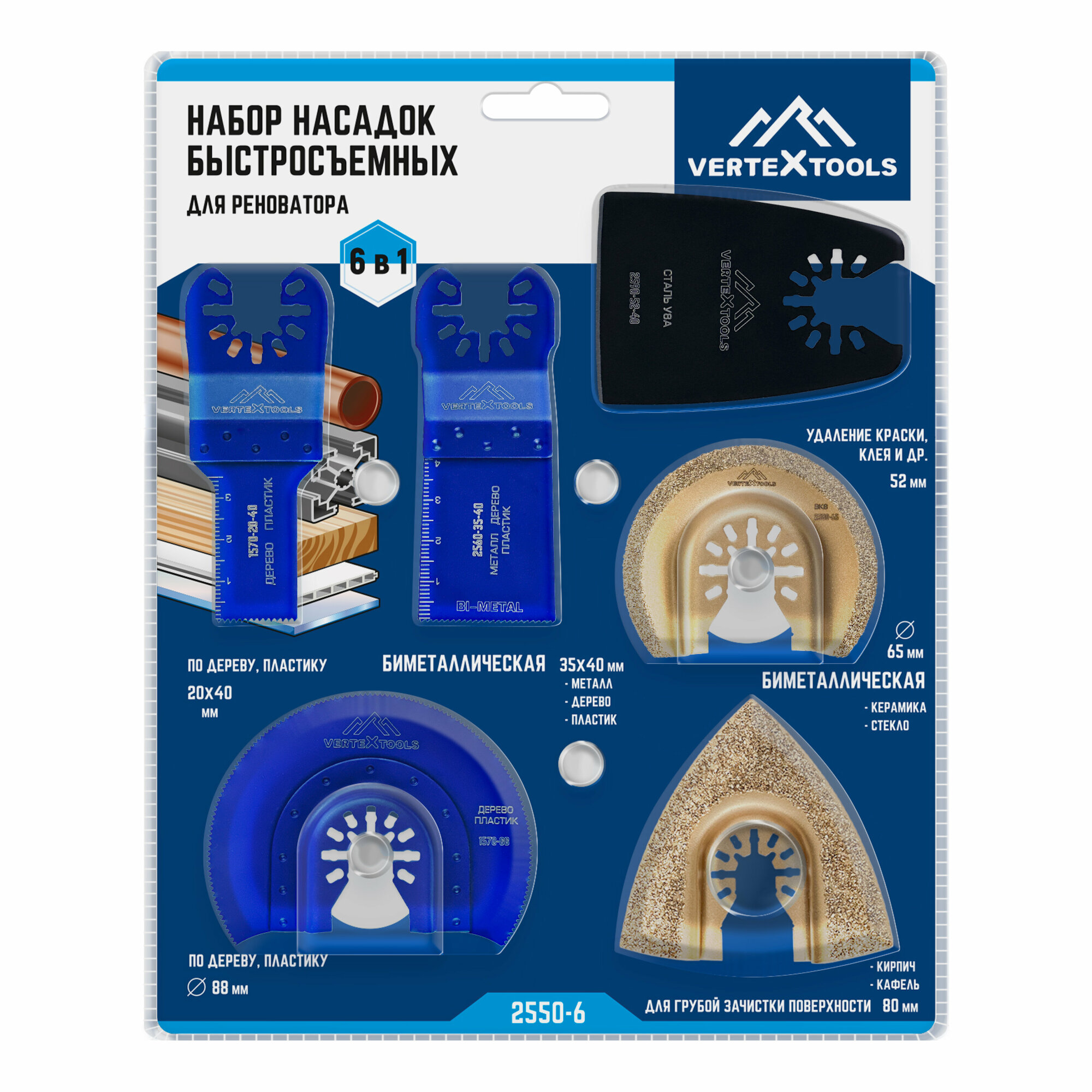 | Дополнительная информация | Набор насадок для реноватора быстросъемная Vertextools 2550-6, 6 шт. |