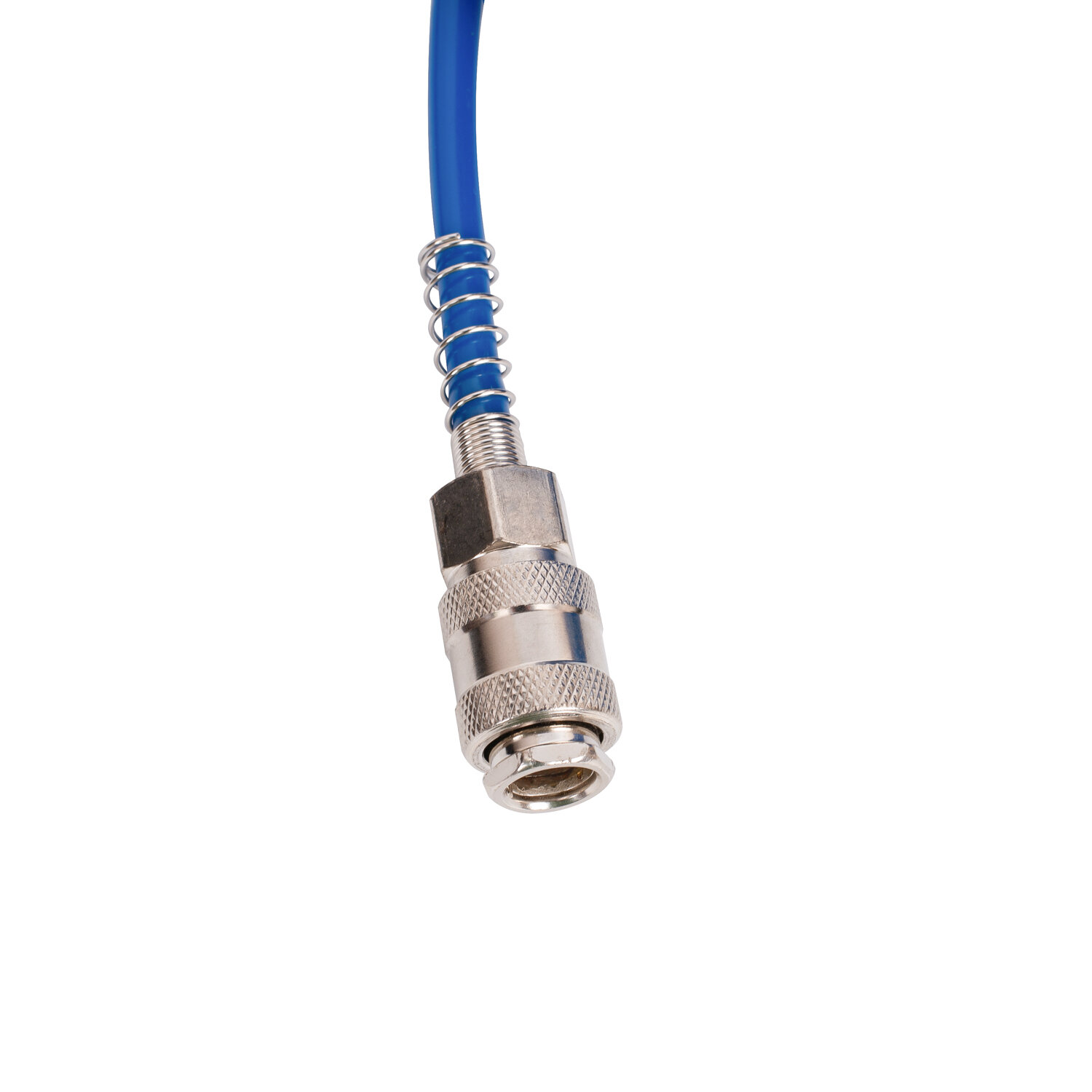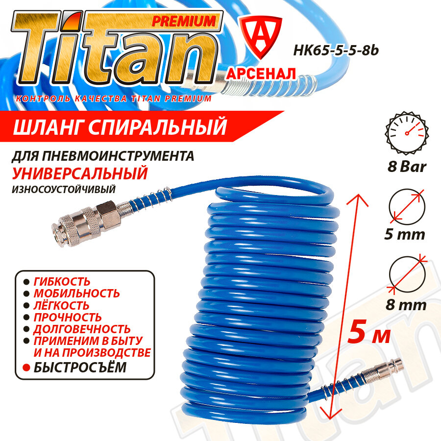 Купить Шланг для пневмоинструмента спиральный 5 метров; d 5мм * 8мм; 8 bar (быстросъёмы евро) синий воздушный для краскопульта, для продувки. Titan, HK65-5-5-8b