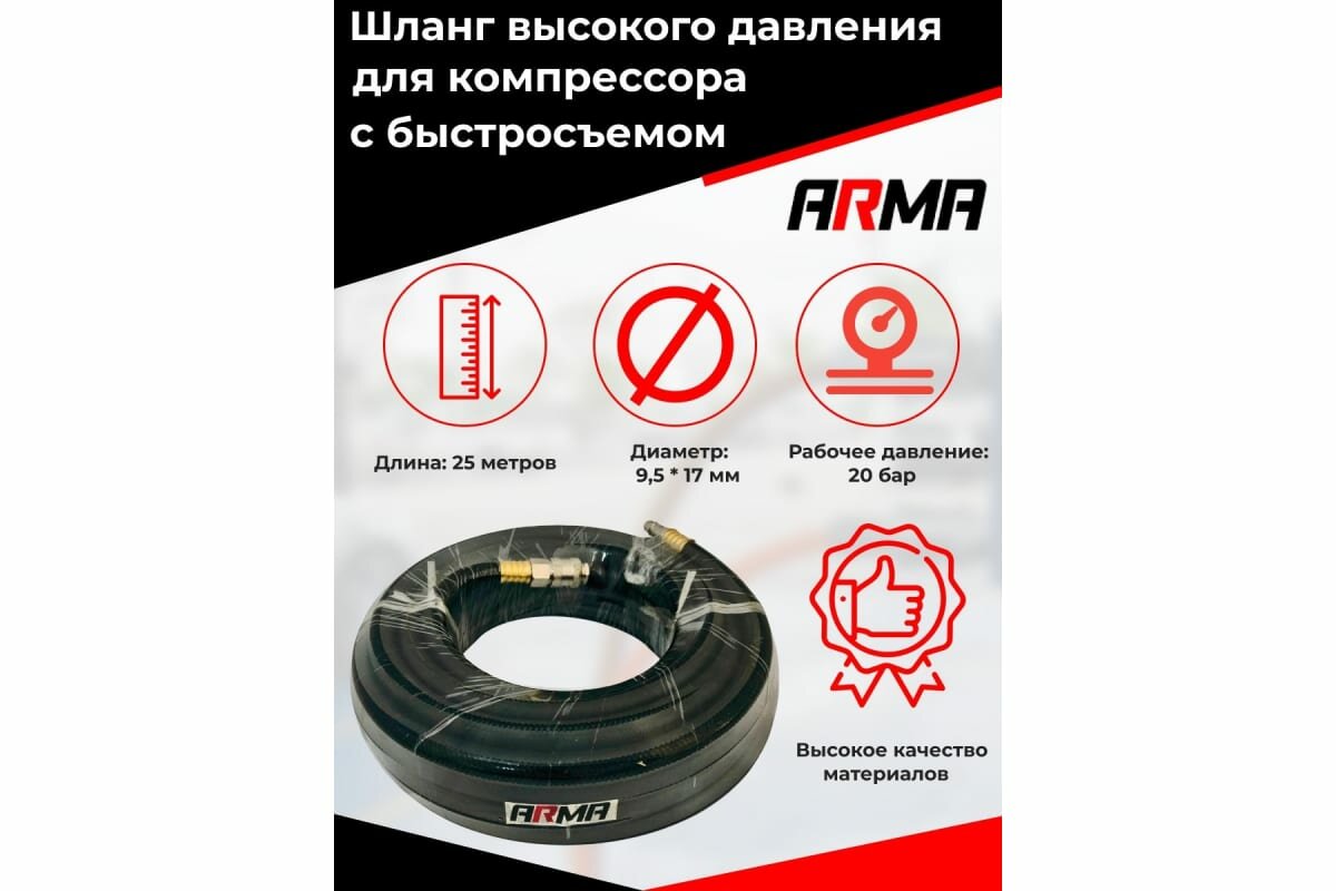 Купить Шланг воздушный, пневматический ARMA, 20 бар, 9,5*17*25м, для компрессора и пневмоинструмента, армированная резина с быстросъемными соединениями профи