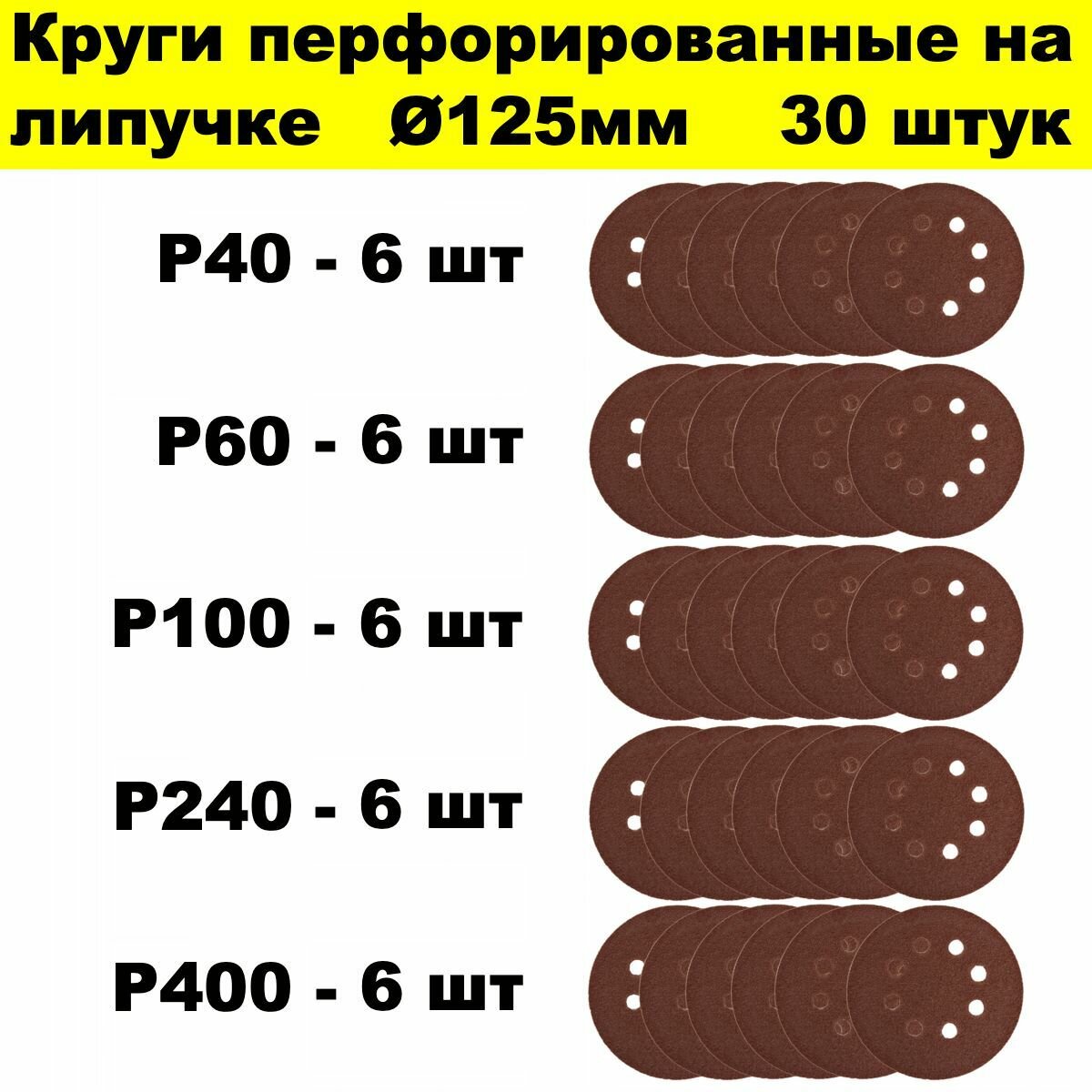 Круги перфорированные шлифовальные 125 мм Р36, Р60, Р100, Р240, Р400 30 штук набор из 5 зернистостей