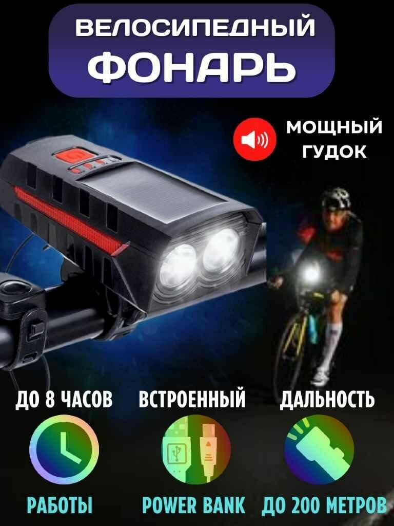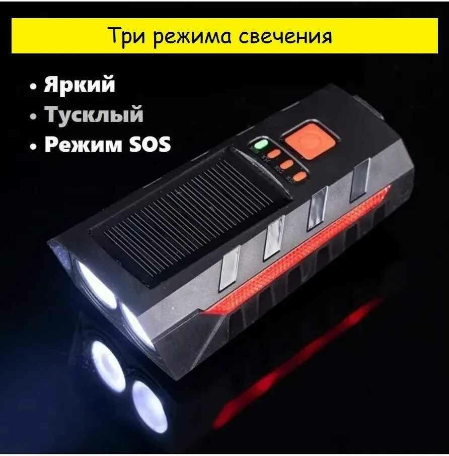 Велосипедный фонарь 400Лм на солнечной батарее и аккумуляторе, передняя фара на велосипед с клаксоном, велофонарь с красным светом