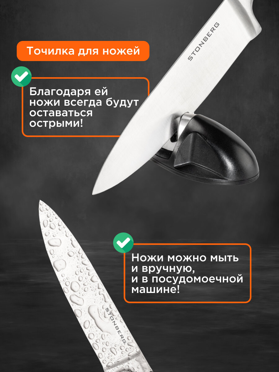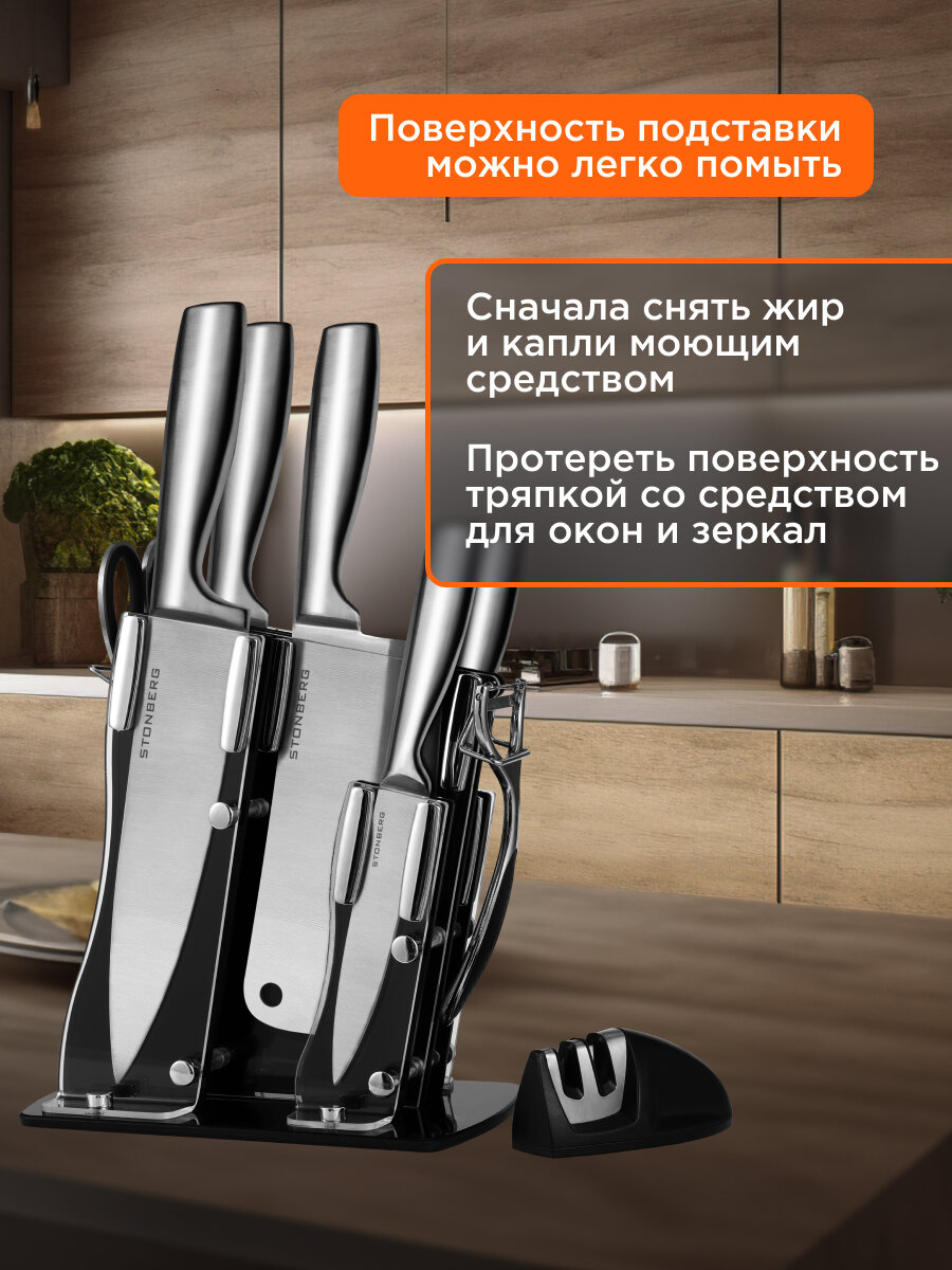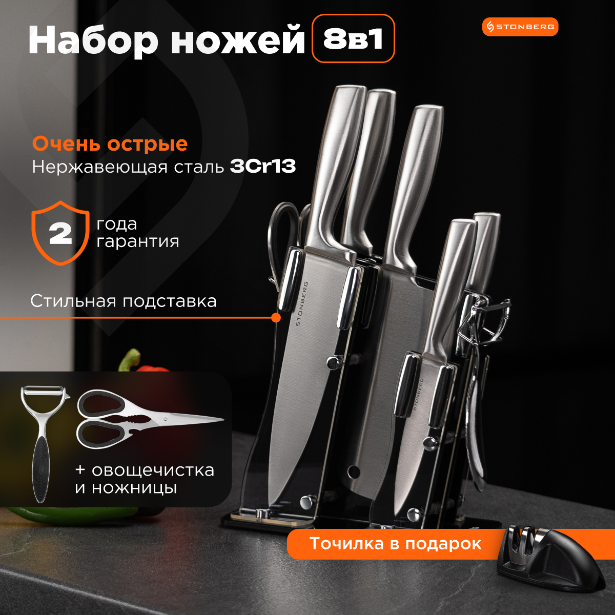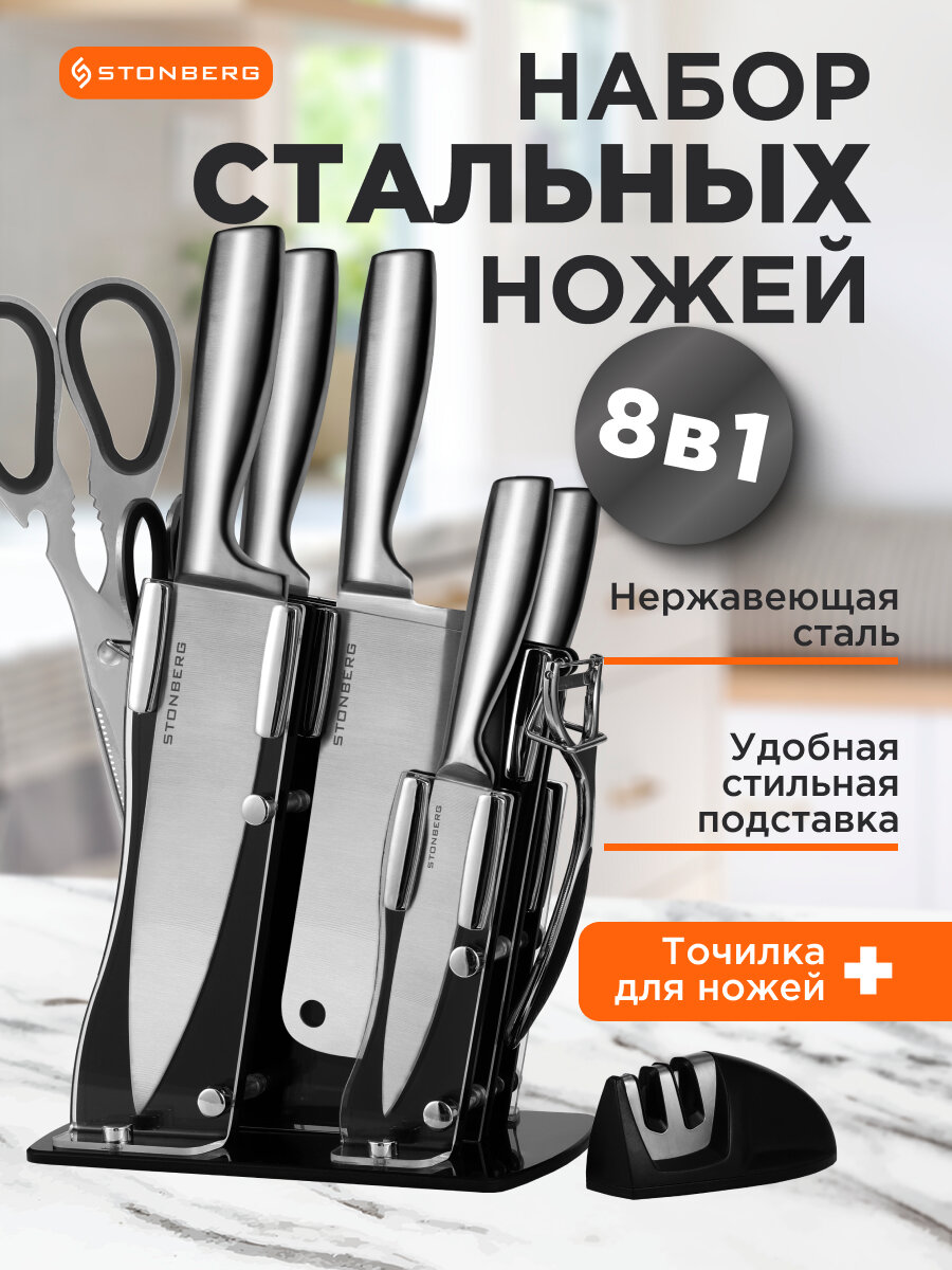 Набор стальных кухонных ножей на подставке Stonberg KS-101-SL, 8 в 1 сталь/черный интересное: