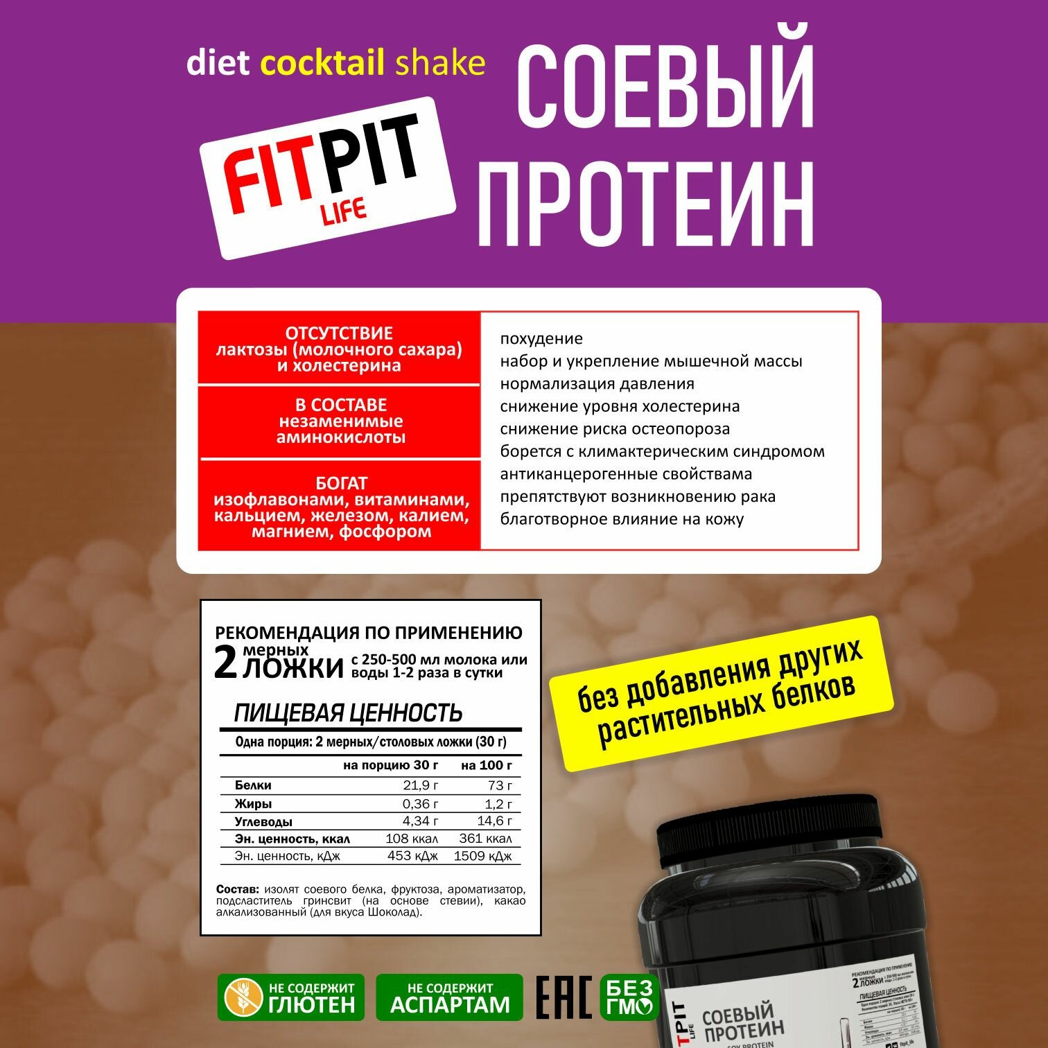 Ниже Вы можете прочитать отзывы на FITPIT Соевый протеин (Изолят соевого белка) без добавления других растительных белков 300 гр Шоколад, ознакомится с подробными характеристиками, посмотреть интересные обзоры и фотографии на FITPIT Соевый протеин (Изолят соевого белка) без добавления других растительных белков 300 гр Шоколад.