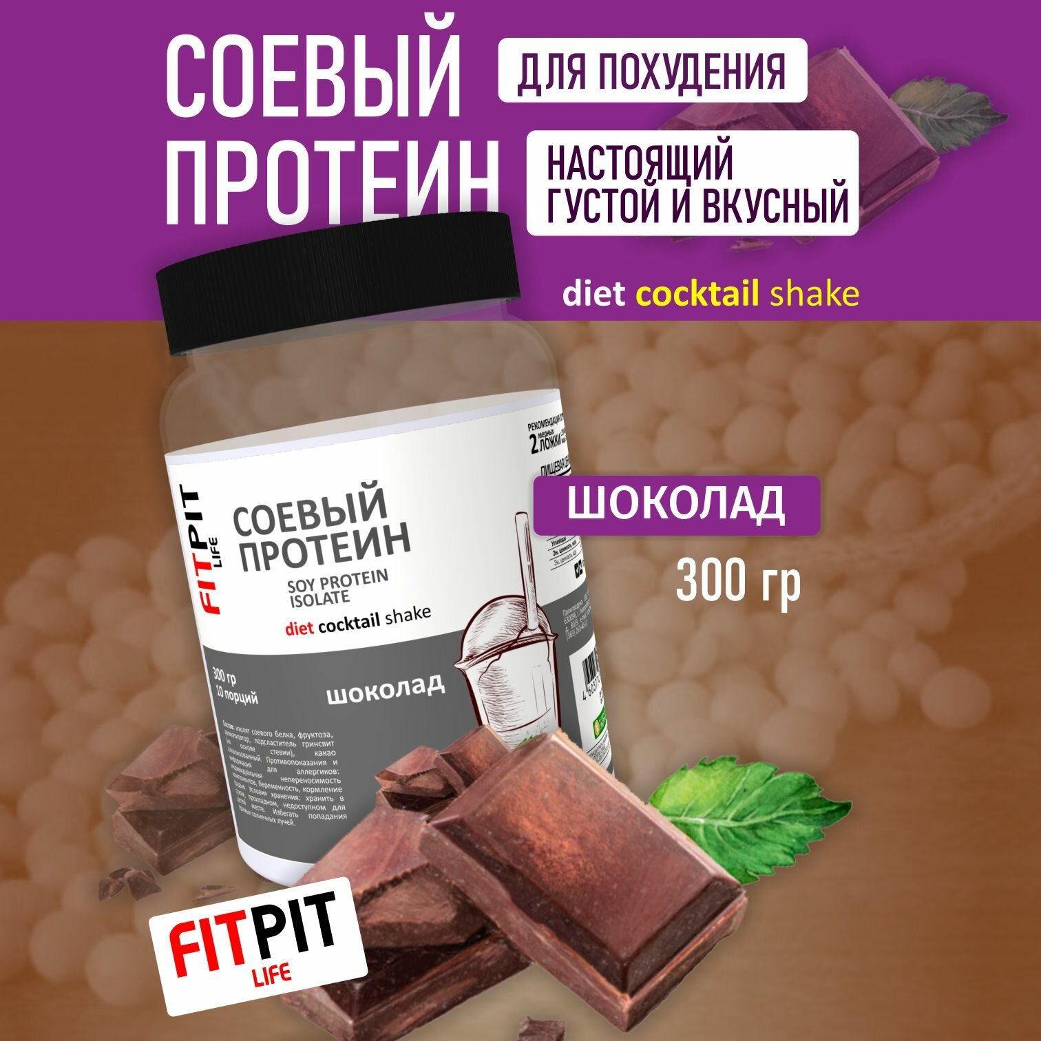 Купить FITPIT Соевый протеин (Изолят соевого белка) без добавления других растительных белков 300 гр Шоколад