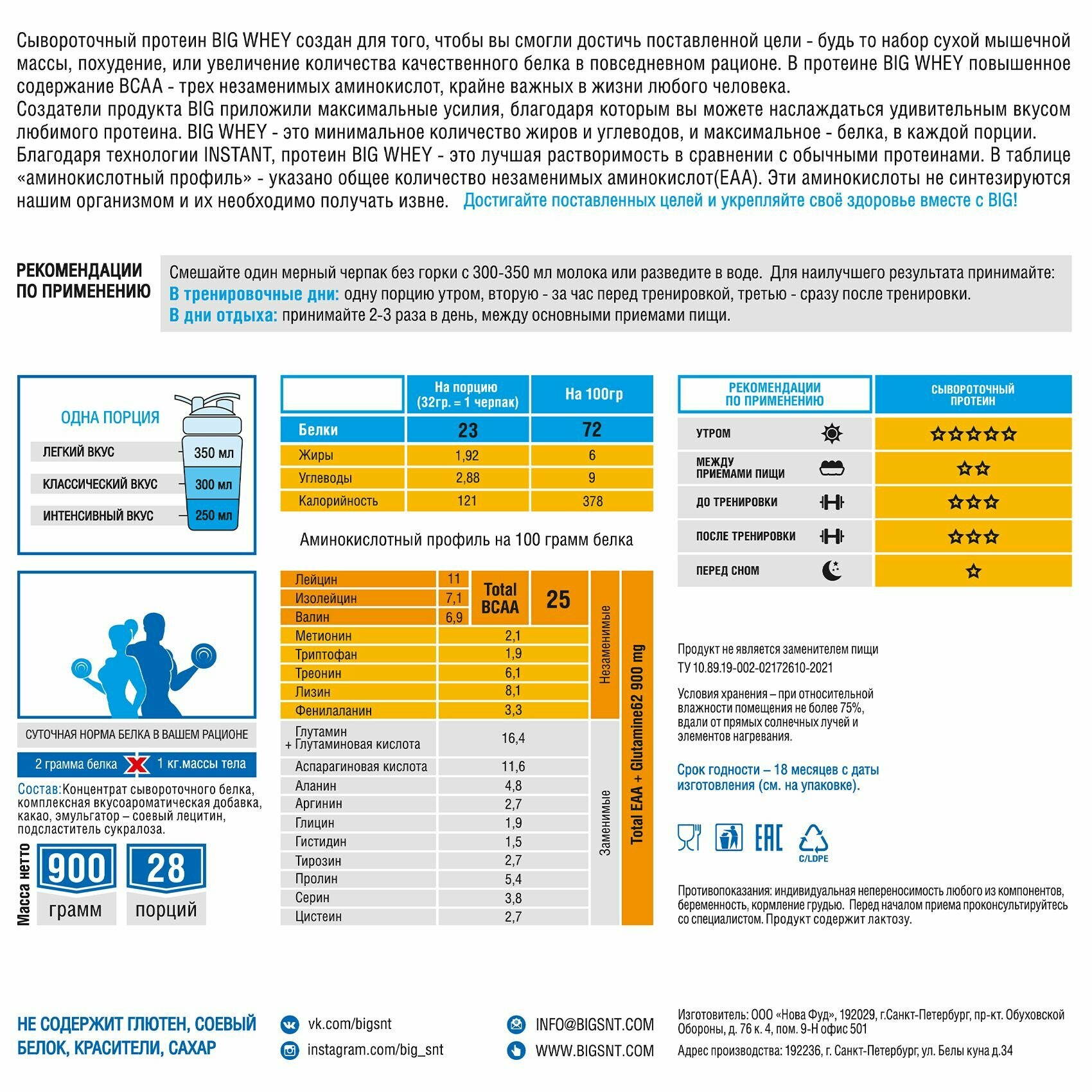 Протеин BIGSNT BIG WHEY сывороточный со вкусом мороженого для набора мышечной массы, похудения, сушки/ спортивное питание, 900 г, 28 порций