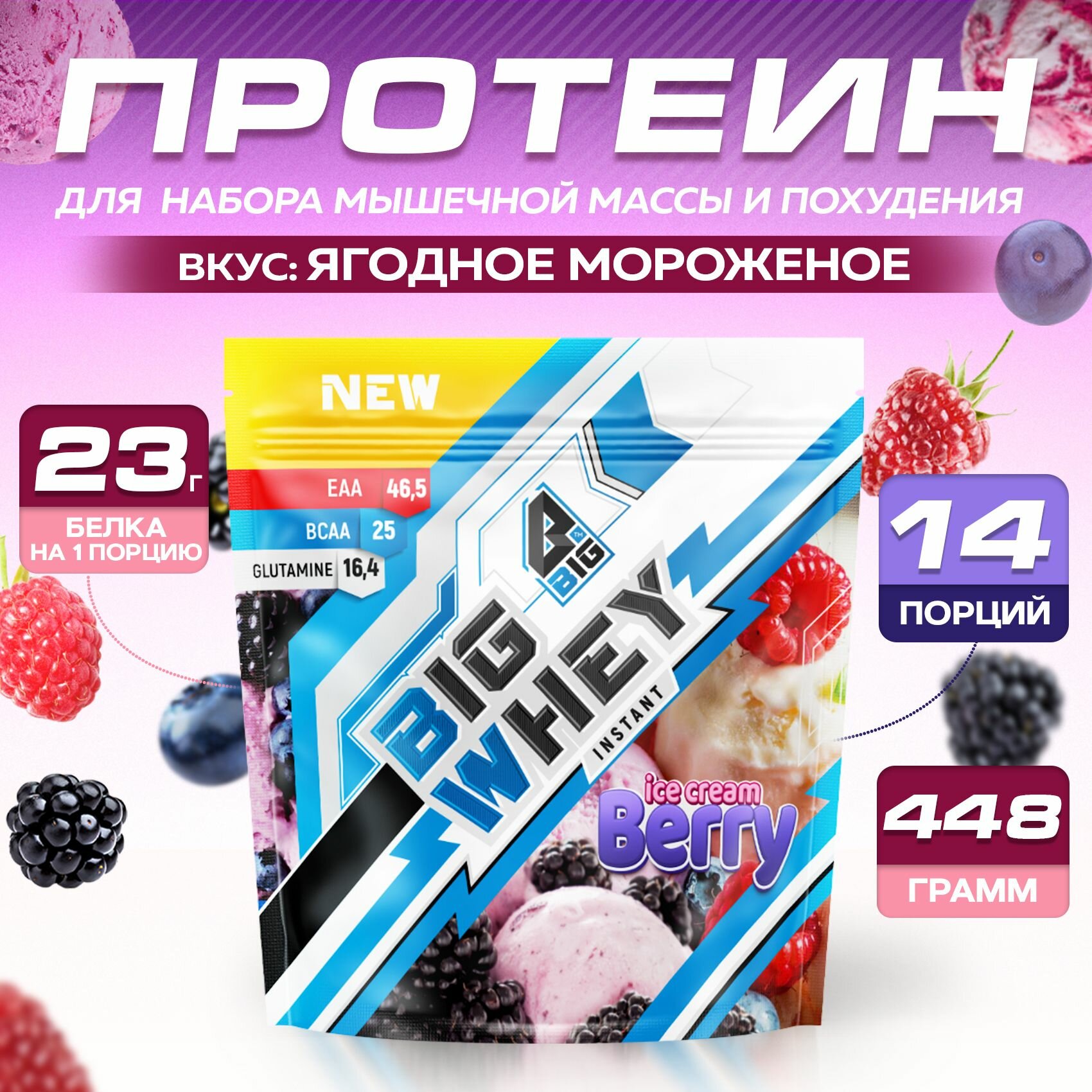 СохранитьПротеин BIGSNT BIG WHEY сывороточный со вкусом ягодного мороженого для набора мышечной массы, похудения, сушки/ спортивное питание, 448 г, 14 порций интересное: