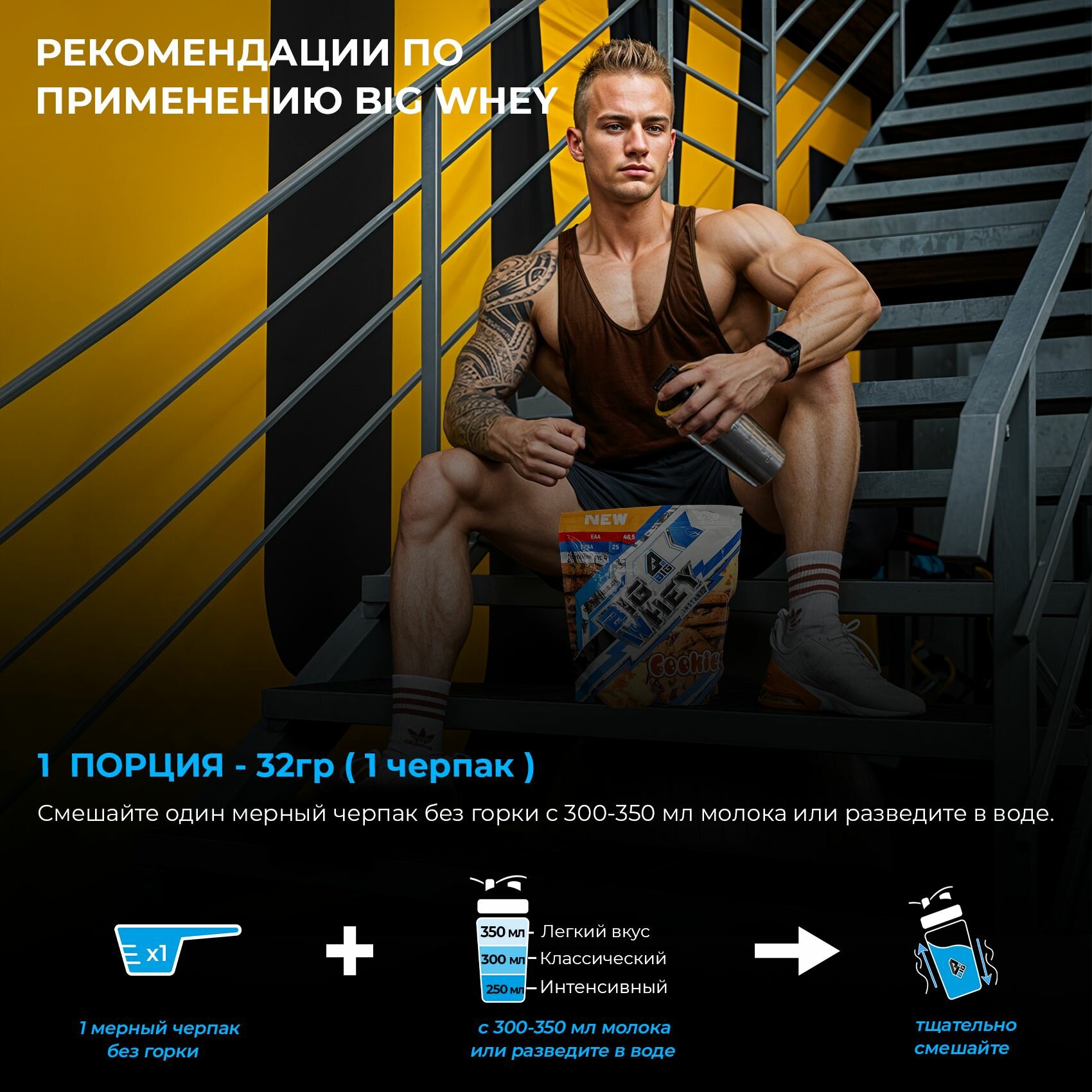 СохранитьПротеин BIGSNT BIG WHEY сывороточный со вкусом печенья для набора мышечной массы, похудения, сушки/ спортивное питание, 448 г, 14 порций интересное: