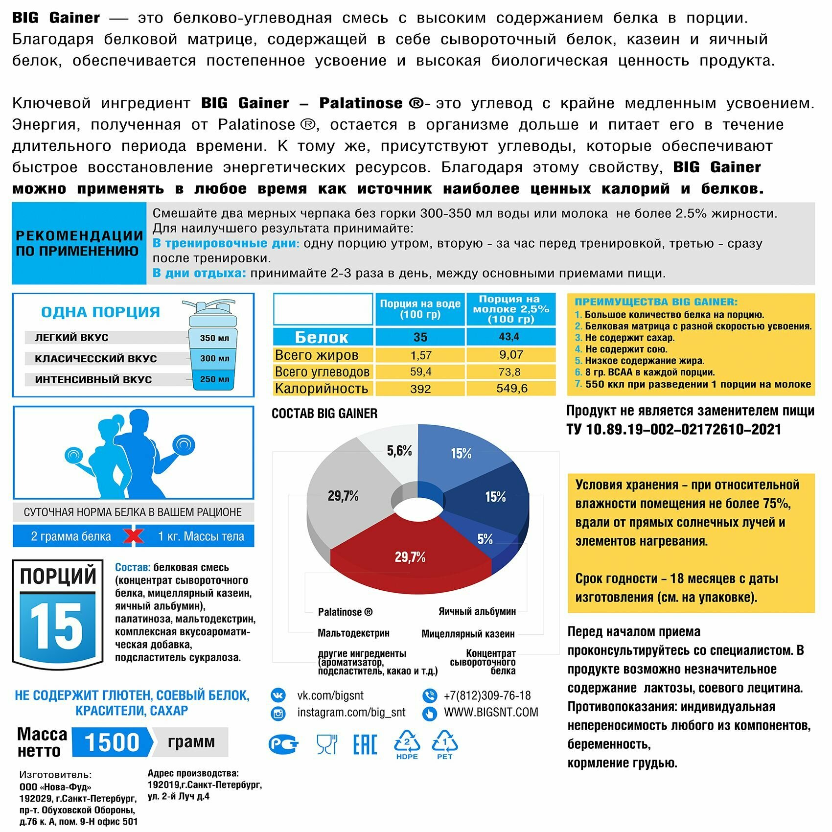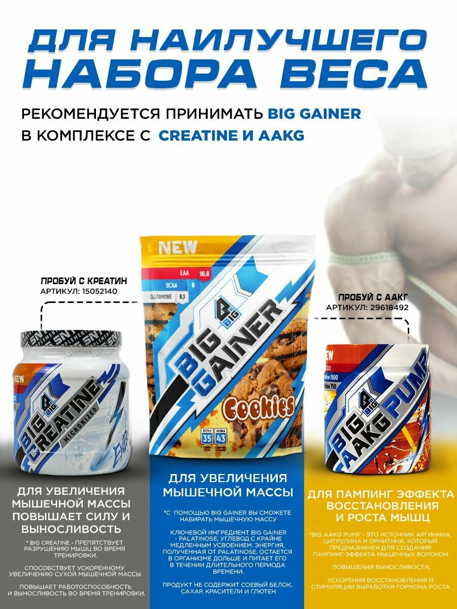 Ниже Вы можете прочитать отзывы на Гейнер BIGSNT BIG GAINER для набора мышечной массы высокобелковый, со вкусом печенье / спортивное питание, 1.5 кг, ознакомится с подробными характеристиками, посмотреть интересные обзоры и фотографии на Гейнер BIGSNT BIG GAINER для набора мышечной массы высокобелковый, со вкусом печенье / спортивное питание, 1.5 кг.