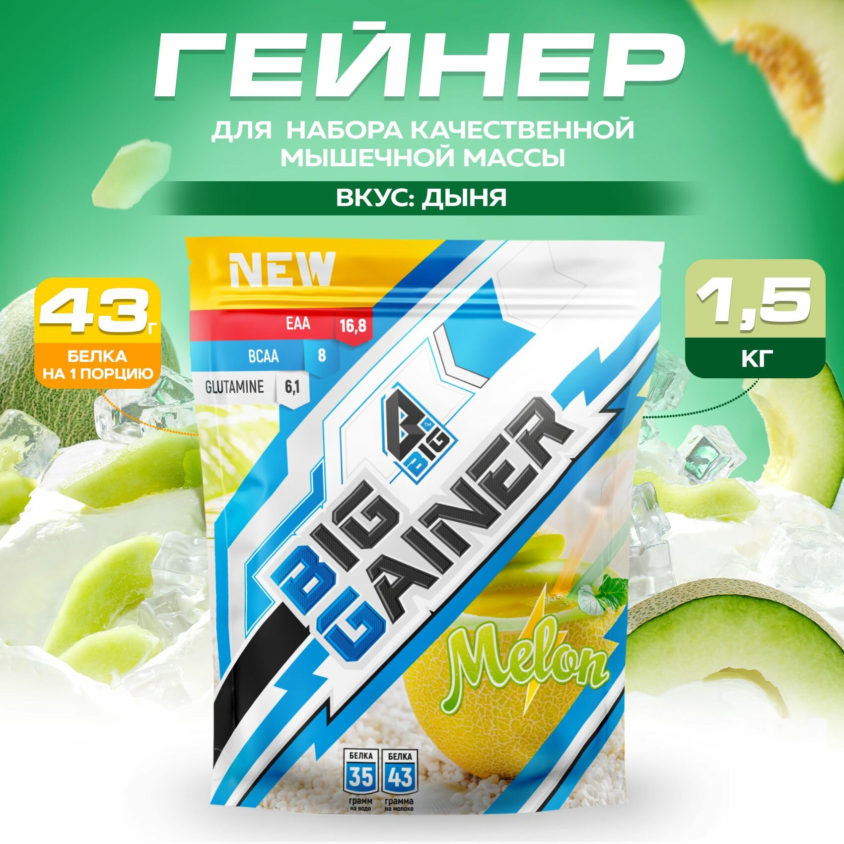 Купить Гейнер BIGSNT BIG GAINER для набора мышечной массы высокобелковый, со вкусом дыни / спортивное питание, 1.5 кг