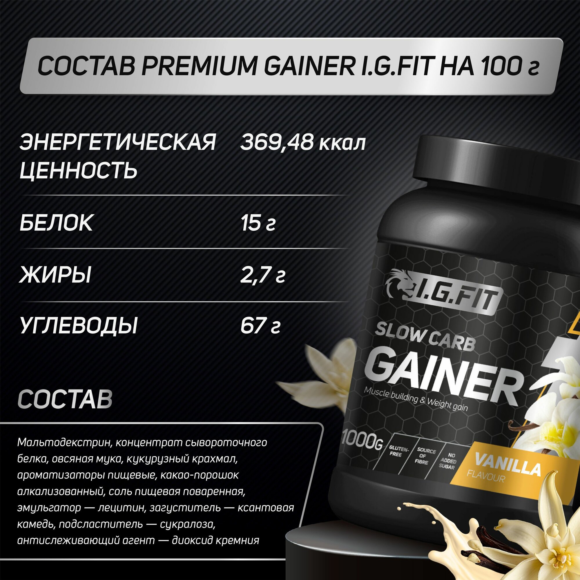 СохранитьГейнер I.G. FIT на сложных (медленных) углеводах со вкусом ваниль, 1000г (спортивное питание для набора веса и мышечной массы с мерной ложкой) интересное: