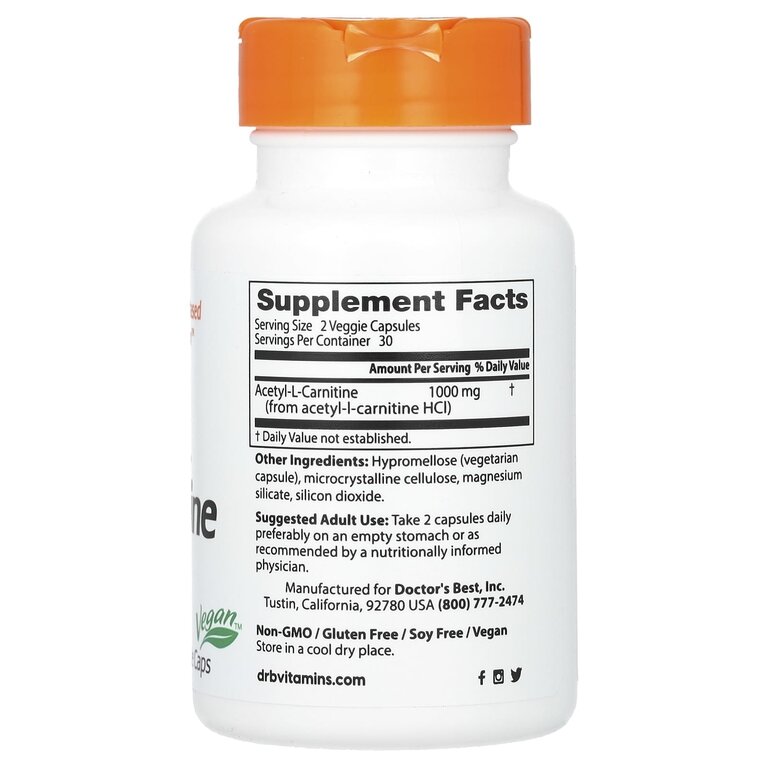 Купить Doctor's Best, ацетил-L-карнитин, 1000 мг, 60 растительных капсул (500 мг в 1 капсуле)