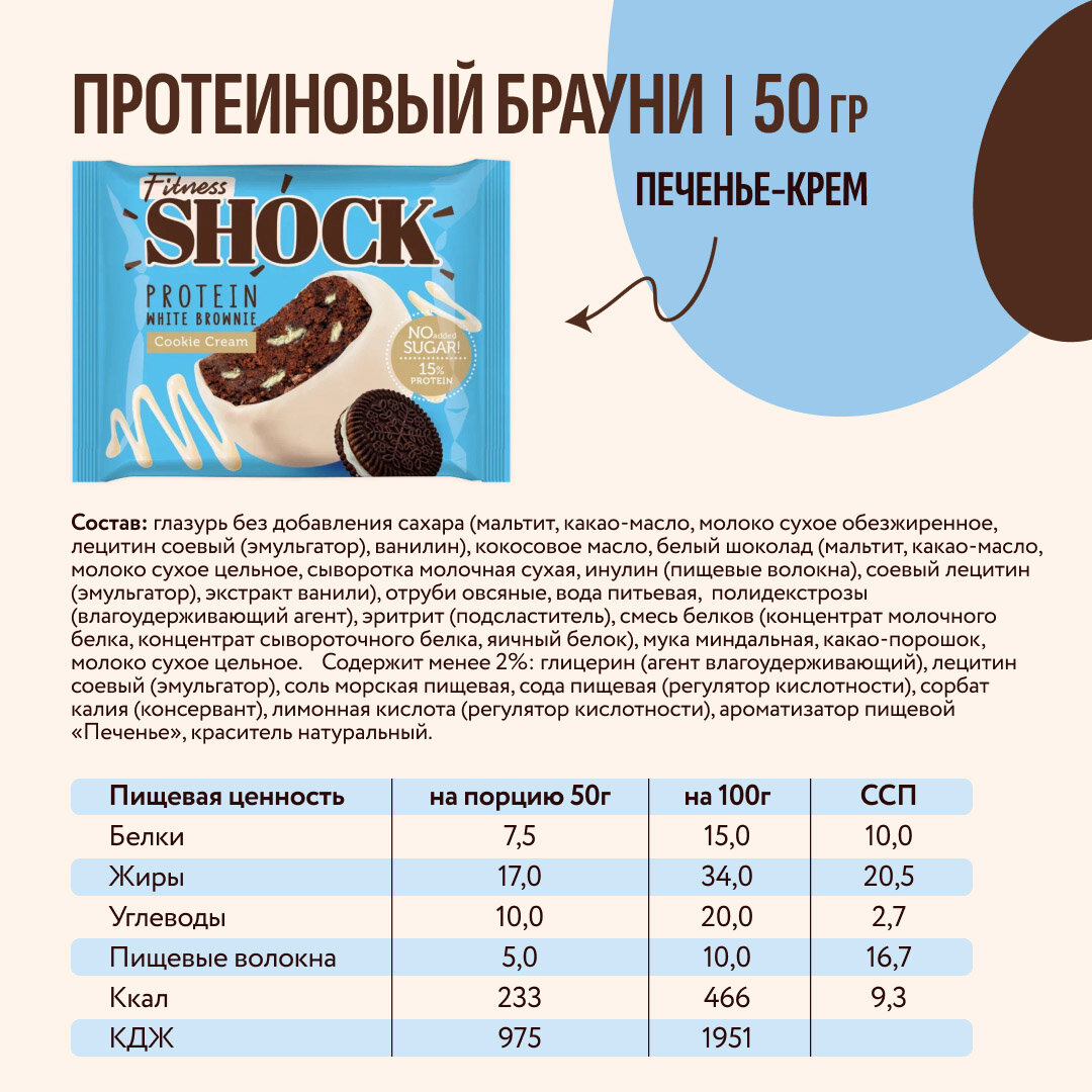 Ниже Вы можете прочитать отзывы на Протеиновое печенье Брауни FitnesSHOCK "Печенье-крем" 10 шт, 50 г, ознакомится с подробными характеристиками, посмотреть интересные обзоры и фотографии на Протеиновое печенье Брауни FitnesSHOCK "Печенье-крем" 10 шт, 50 г.