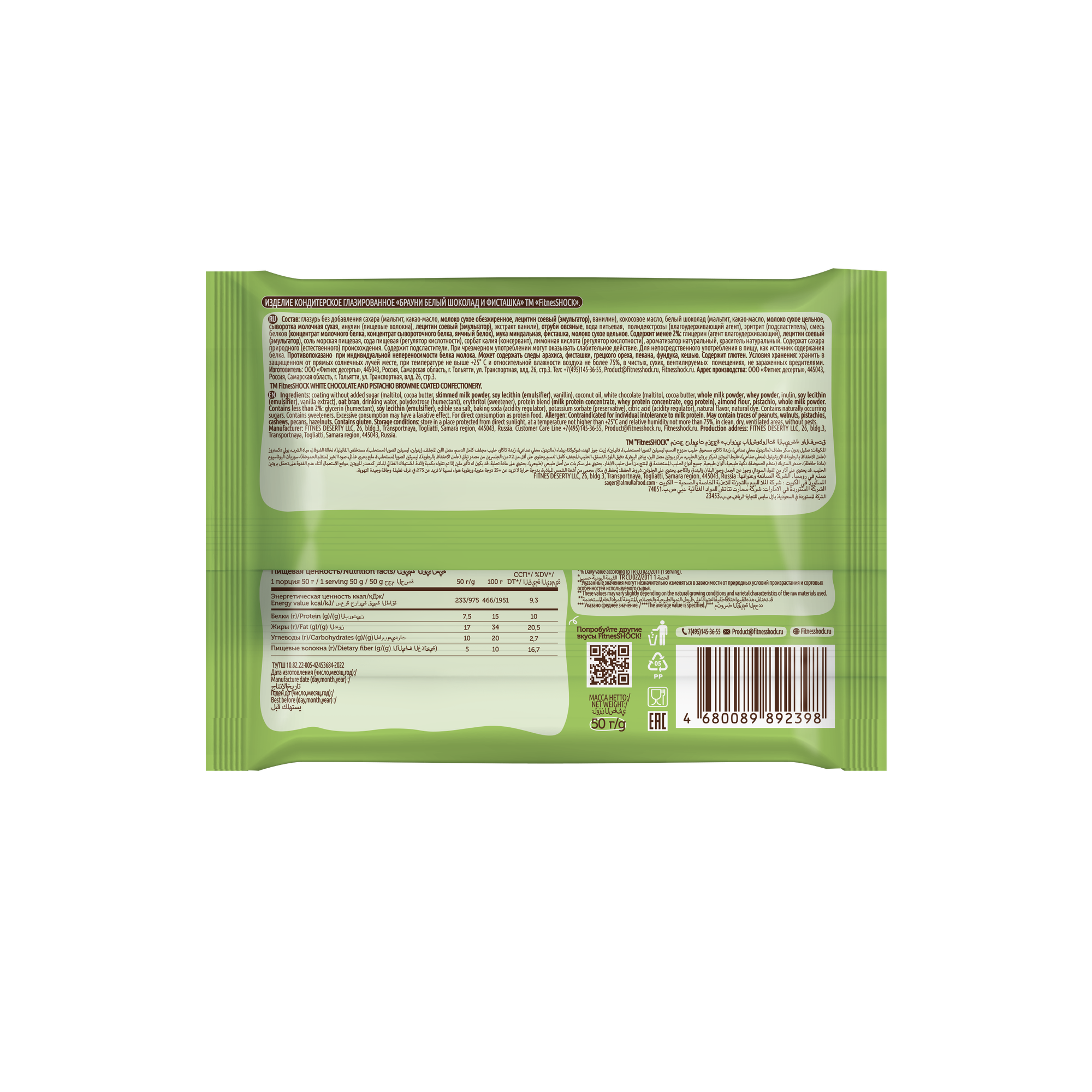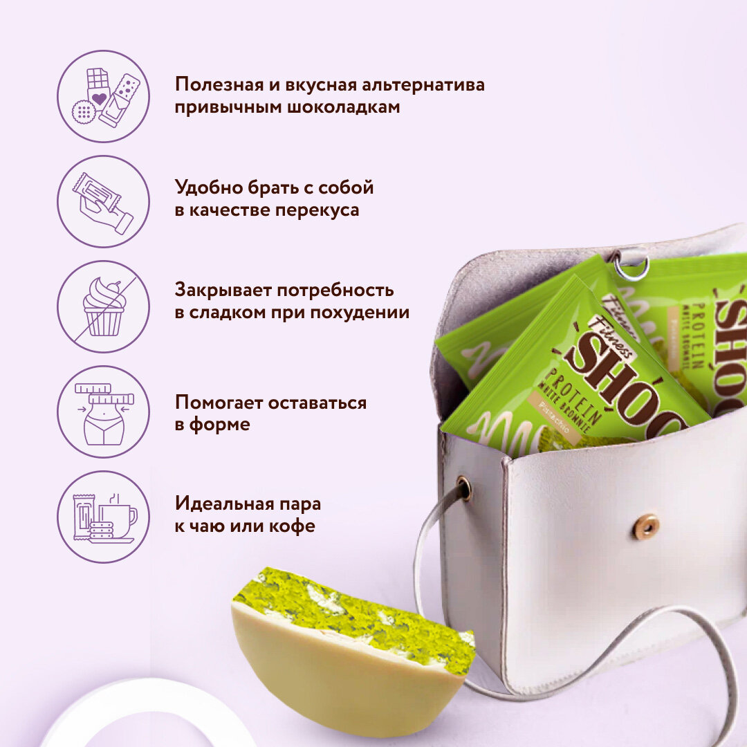 СохранитьПеченье протеиновое FITNESSHOCK Брауни Белый шоколад и фисташки, 10 шт. по 50 г в шоу-боксе, 27668 интересное: