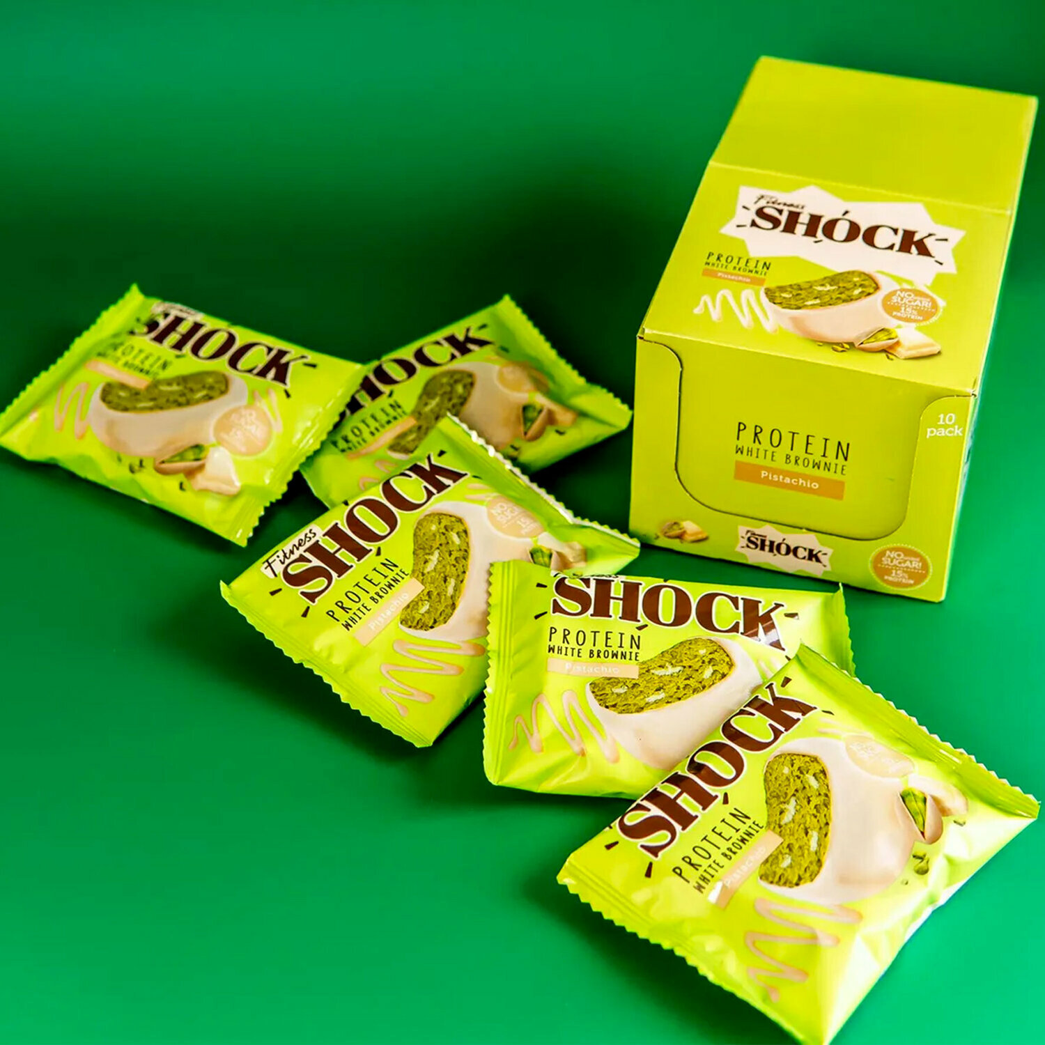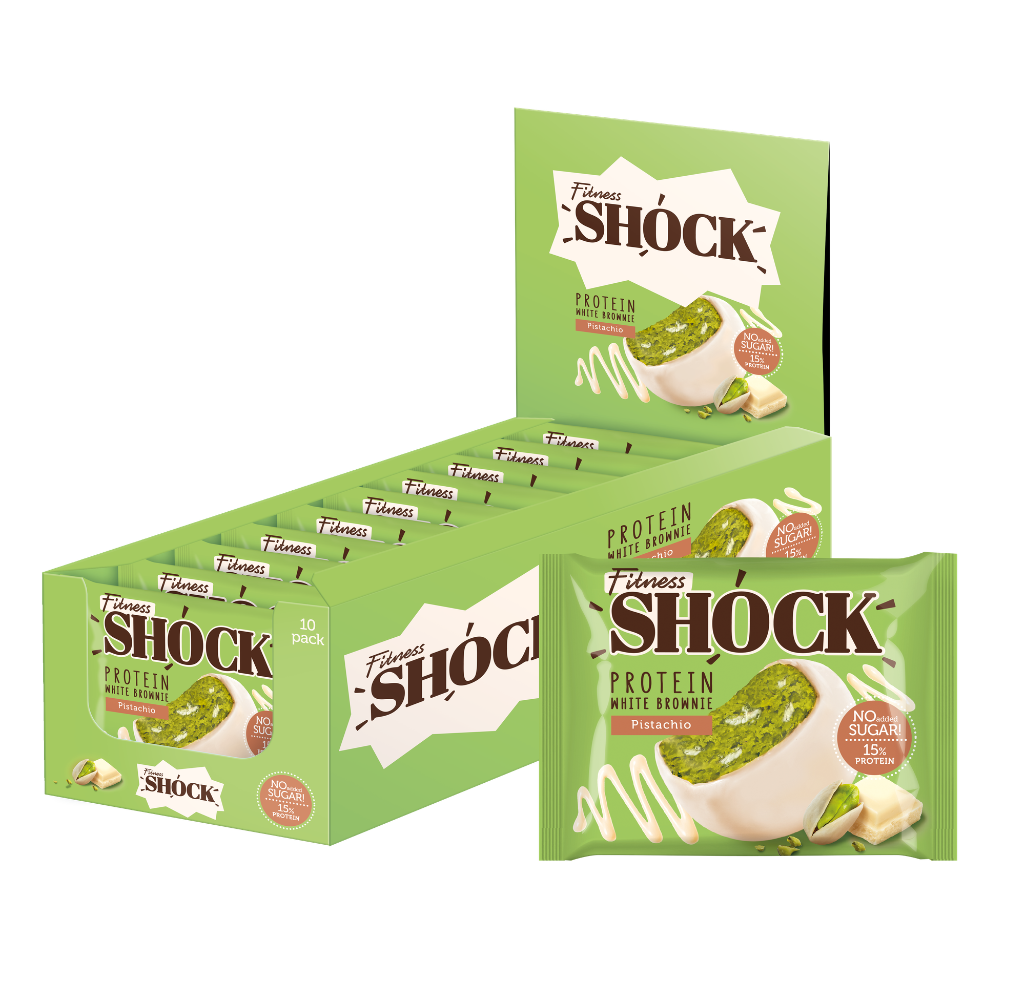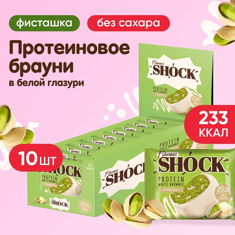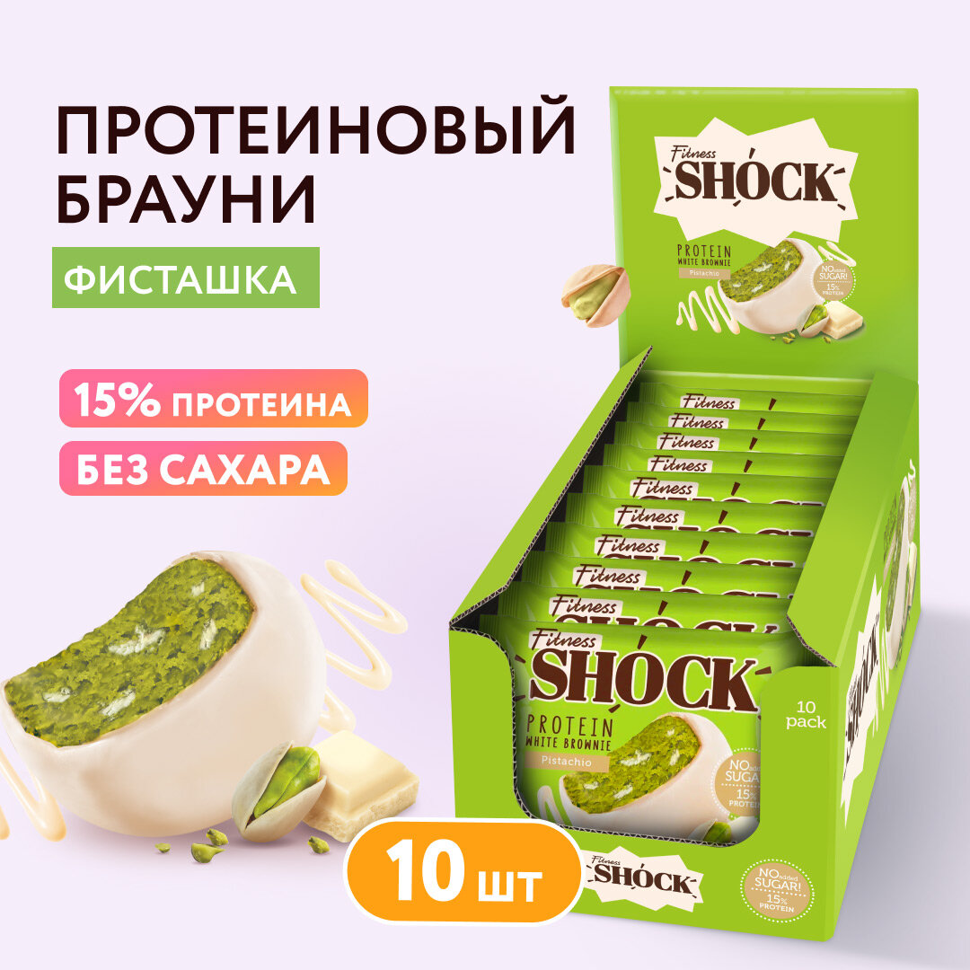 Купить Печенье протеиновое FITNESSHOCK Брауни Белый шоколад и фисташки, 10 шт. по 50 г в шоу-боксе, 27668