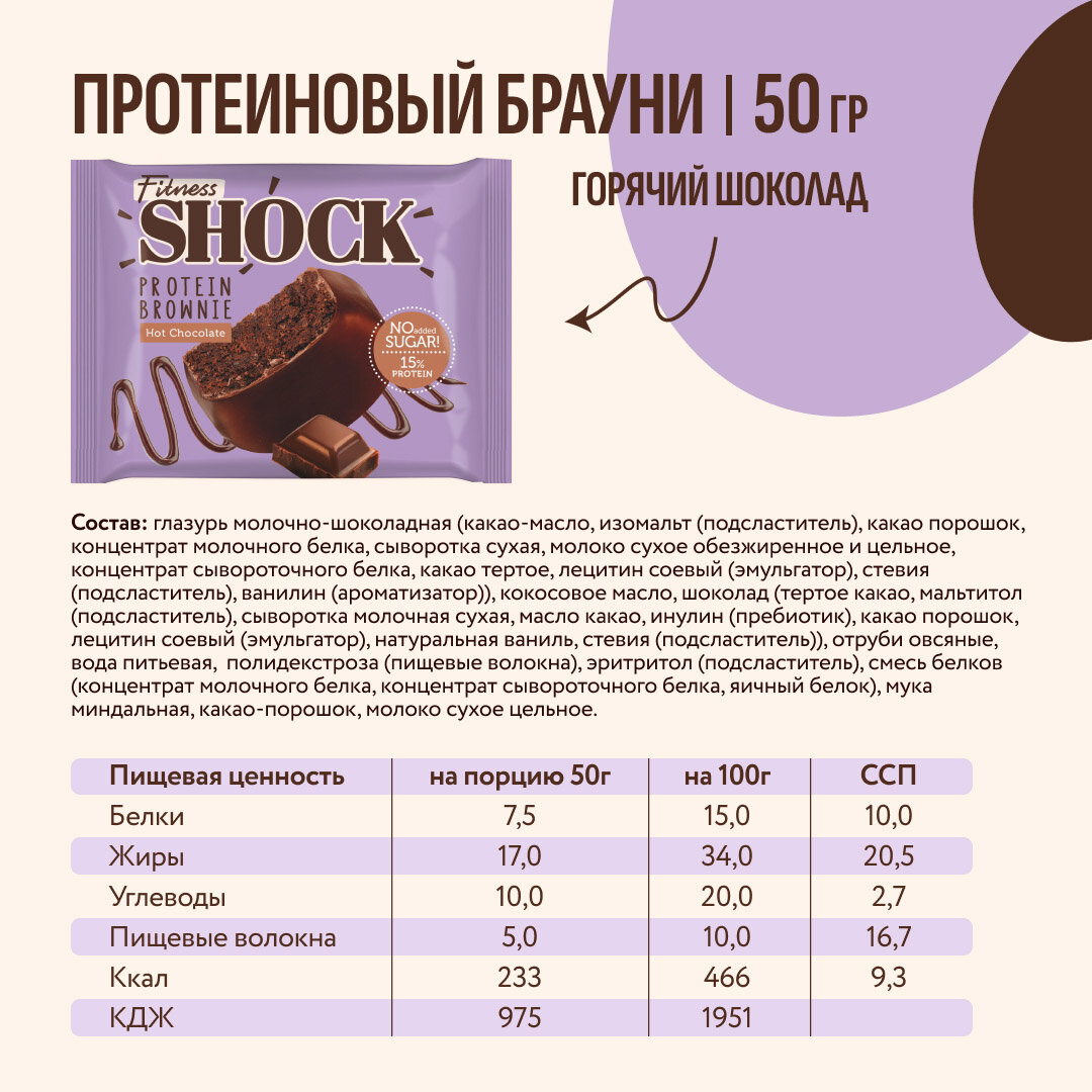 СохранитьПротеиновое печенье без сахара Брауни Горячий шоколад FitnesSHOCK бисквит, брауни без сахара, 50 г х 10 шт интересное: