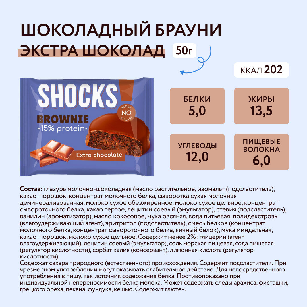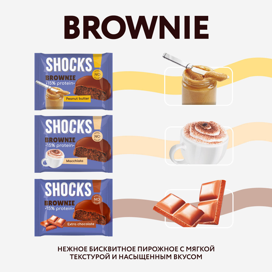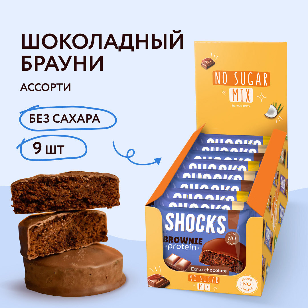 Протеиновое печенье без сахара Брауни без сахара SHOCKS! Ассорти (шоколадный, кофе с молоком, арахисовая паста), бокс 9 шт, пп, сладости от FitnesSHOCK интересное: