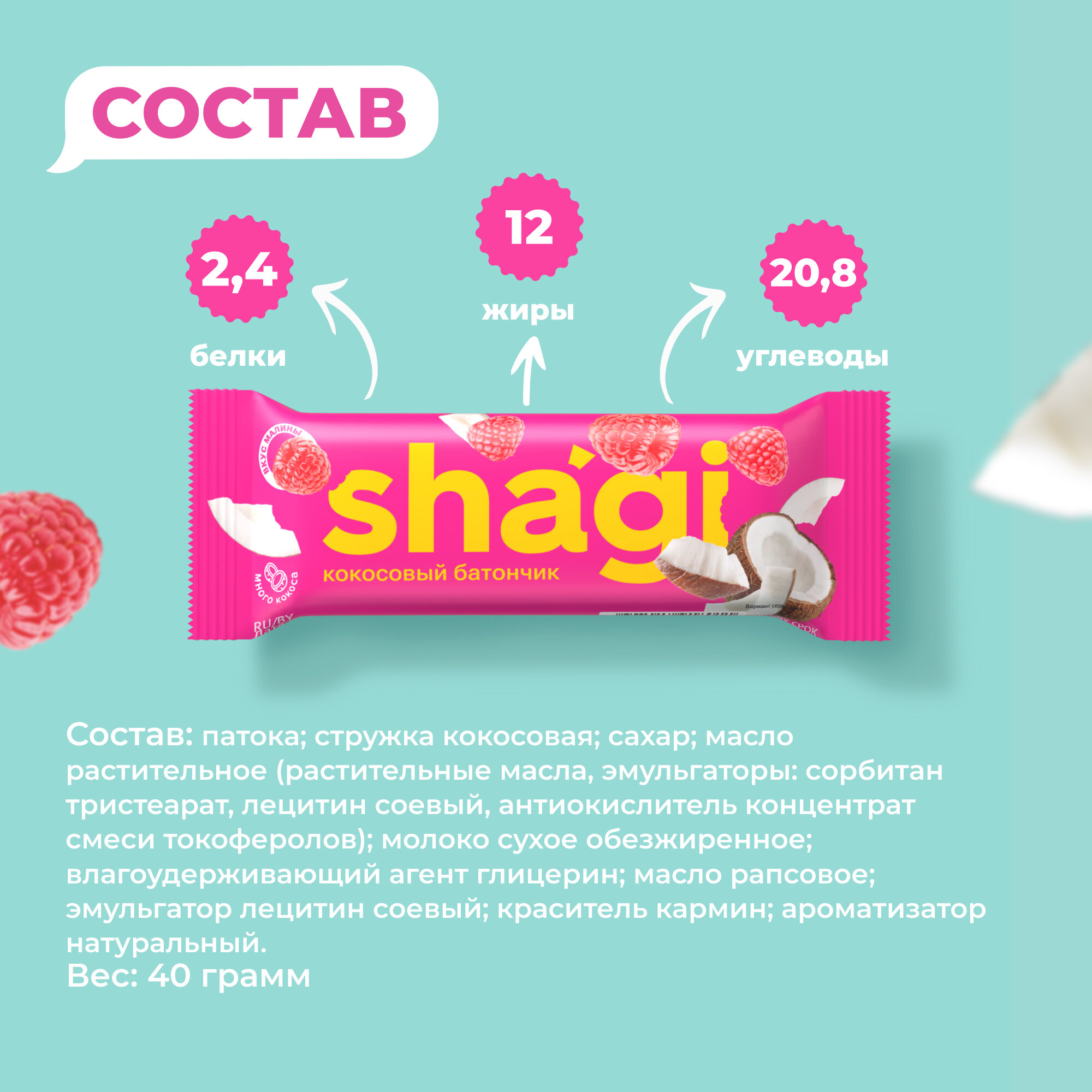 Батончик кокосовый Shagi Малина, 40 гр х 15 шт, спортпит, пп, полезные сладости, спорт, десерты