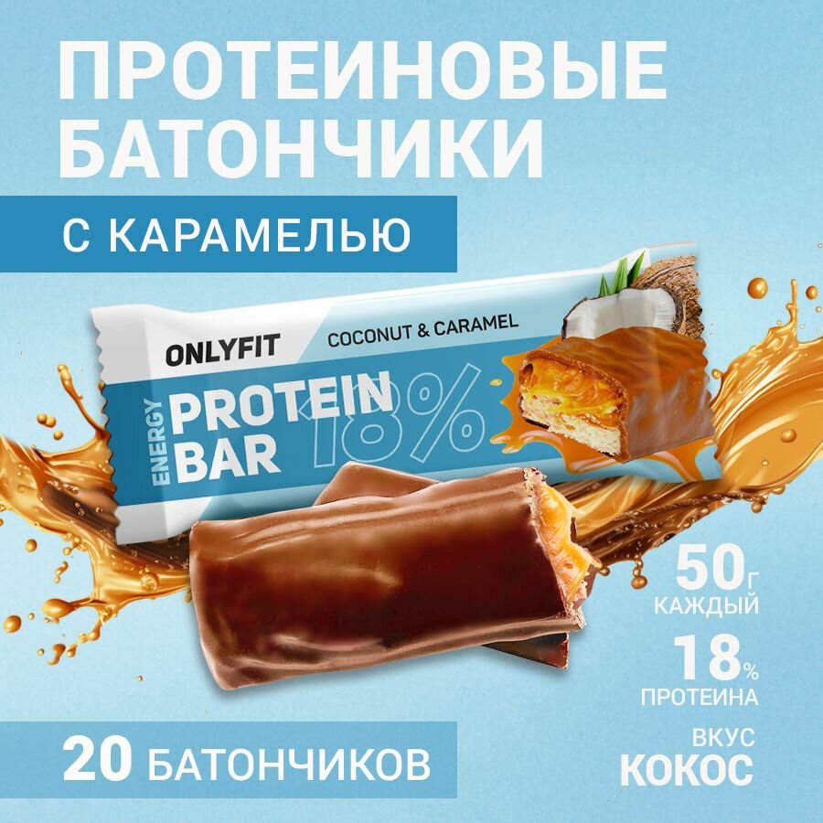 Купить Протеиновый батончик ONLYFIT, глазированный с карамелью, вкус "Кокос и карамель" 20 штук по 50г
